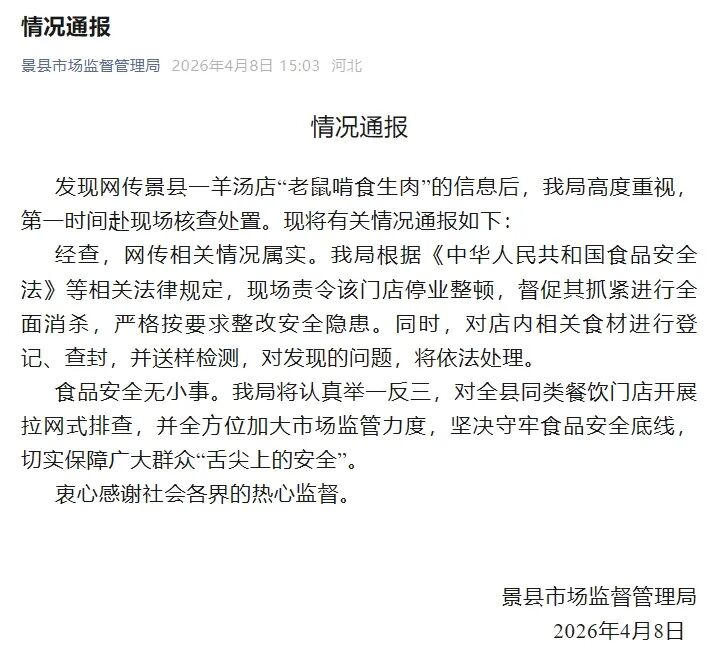 据极目新闻此前报道,4月7日,有网友曝光了在河北衡水市景县一家羊汤店拍到的场景:店内人声鼎沸,食客满屋,而镜头一转,透过玻璃,只见一只硕鼠正在后厨啃食一大块生肉,爬上爬下。4月8日上午,景县市监局工作人员告诉记者,此事他们已关注,正在依法依规调查处理。