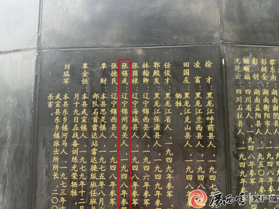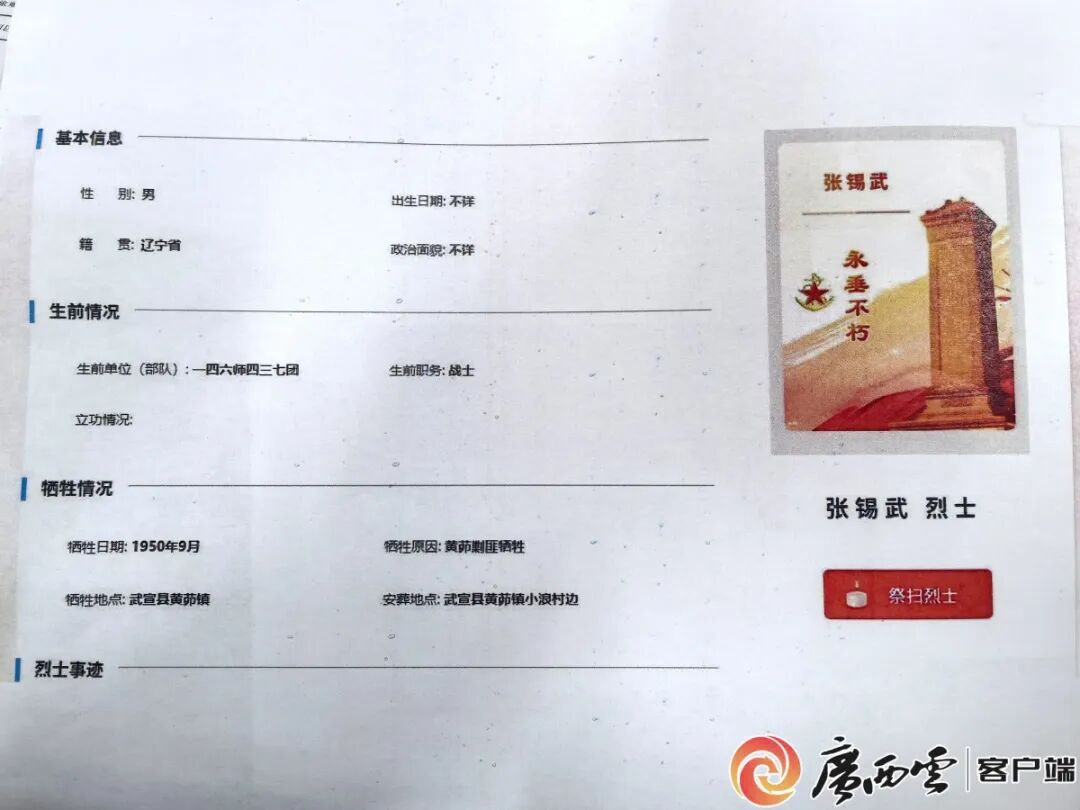 王万里随即搜索来宾的烈士信息,果然查到“张锡武烈士”,牺牲原因为“黄茆剿匪牺牲”,安葬地点在“武宣县黄茆镇小浪村边”。“姓名、籍贯、牺牲时间、部队番号全部对上了,证明这就是辽宁方面寻找的烈士。”当晚,他第一时间将消息告诉了朱昱。