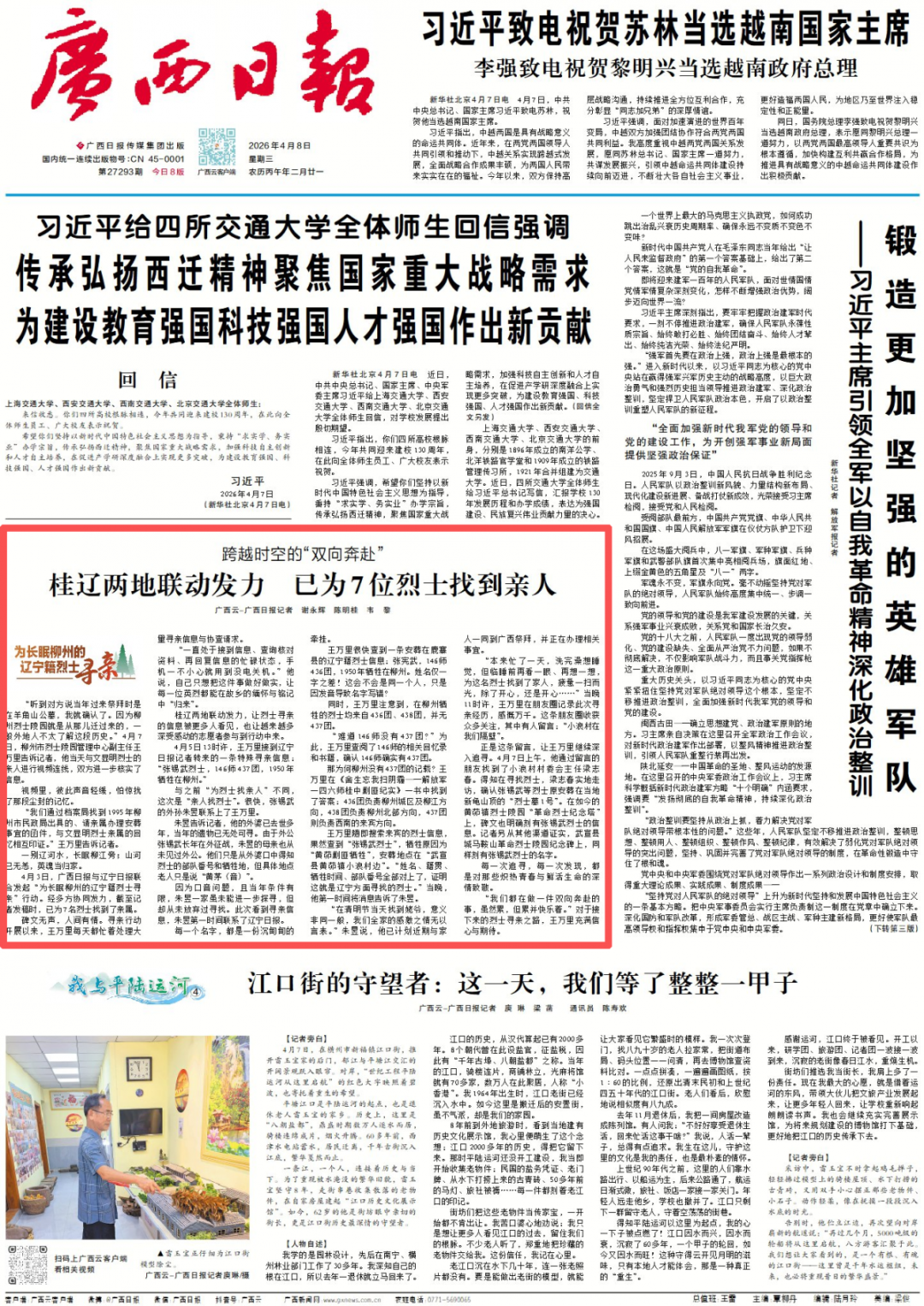 4月3日,广西日报与辽宁日报联合发起“为长眠柳州的辽宁籍烈士寻亲”行动。经多方协同发力,截至记者发稿时,已为7名烈士找到了亲属。