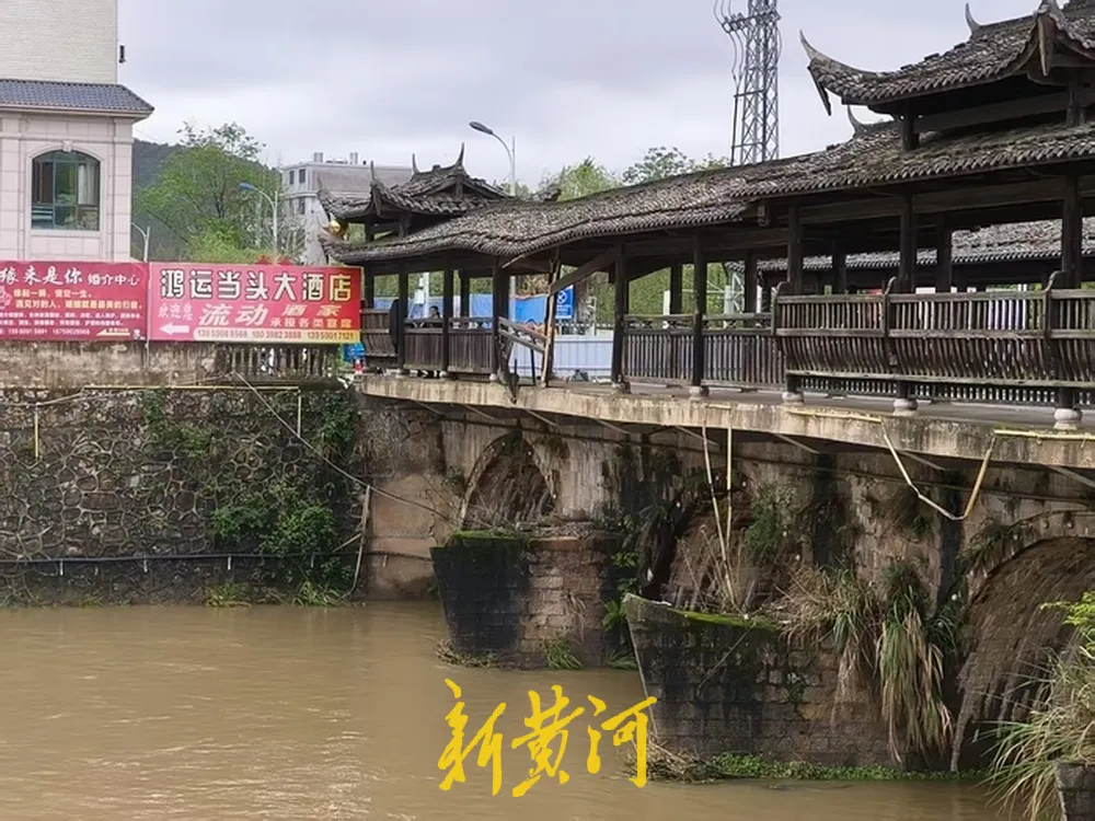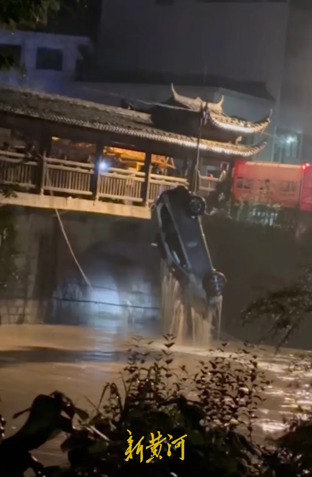 现场视频显示,一辆小汽车一头栽到河里,河水水流湍急,当地救援使用吊车将小汽车缓缓吊起上岸,车辆车头受损严重。还有现场视频显示,受损的桥为一座带有廊道的多拱桥,桥一侧的护栏被撞坏。