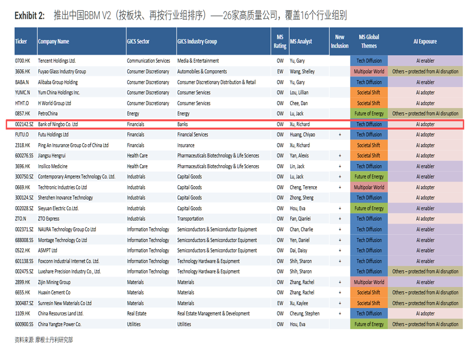 摩根士丹利发布《中国最佳商业模式V2》报告红框处为宁波银行