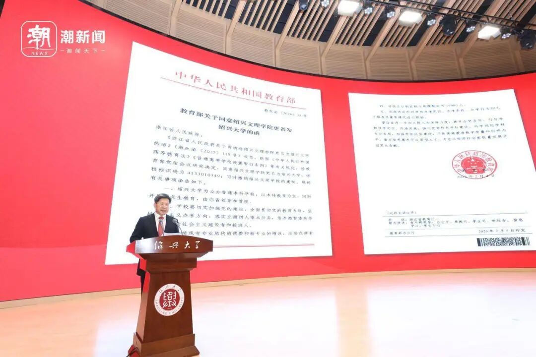 绍兴大学更名工作历经多年准备。早在2006年,绍兴文理学院即提出,以“十一五”规划为指导,高举绍兴大学的旗帜,大力提升内涵的同时,实现规模扩张,“整合力量,早日建成绍兴大学”。2019年,绍兴文理学院更名设置绍兴大学工作取得重要进展。 2026年伊始,好消息接踵传来。2月4日,教育部正式批复同意绍兴文理学院更名为绍兴大学。2月26日,浙江省人民政府下发通知予以确认。4月8日,绍兴大学正式揭牌。