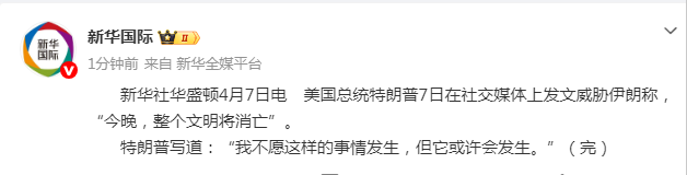 美国总统特朗普7日在社交媒体上发文威胁伊朗称,“今晚,整个文明将消亡”。
