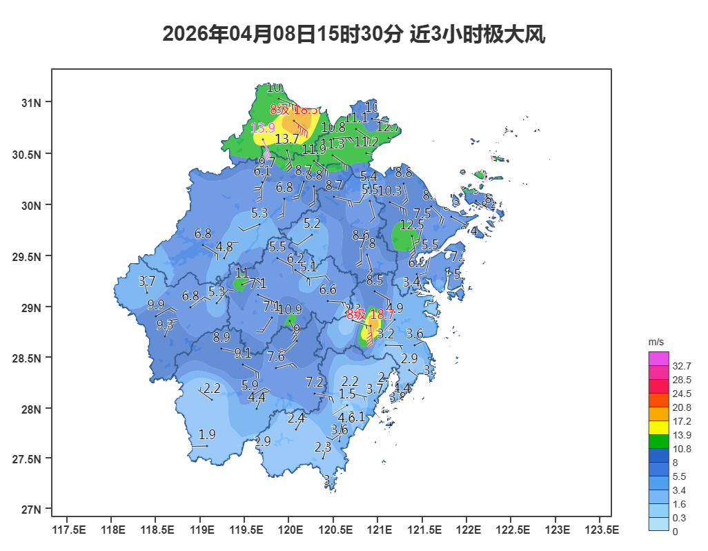 今天强盛的暖湿气流进一步推高气温,预计全省最高均可达到30℃,热意明显。今天午后到夜里,冷暖空气交汇,降水变得明显,浙北和浙中西部还会伴有雷电活动,谨防短时暴雨、雷暴大风和局地冰雹;11日浙北和浙中部分有中到大雨,局部暴雨,大家注意防范!