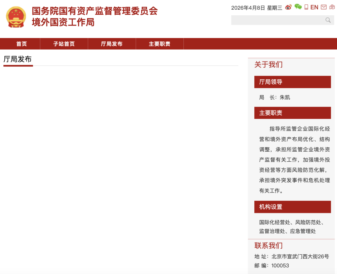 国务院国资委官网显示,国务院国资委境外国资工作局,局长为朱凯,主要职责为指导所监管企业国际化经营和境外资产布局优化、结构调整,承担所监管企业境外资产监督有关工作,加强境外投资经营等方面风险防范化解,承担境外突发事件和危机处理有关工作。机构设置包括:国际化经营处、风险防范处、监督治理处、应急管理处。