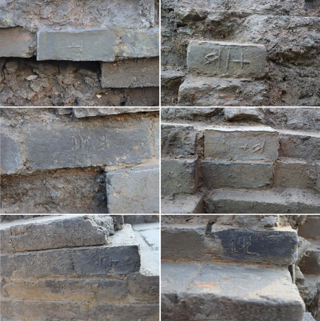 城墙墙体底宽不超过11.4米,由内外包边和土芯组成。内包边仅存小段包砖及基槽(图四),最高处尚存15层砖、厚1.2米,丁顺结合,最下层砖露龈0.04米,上部砖收分较明显;包边用砖规格37厘米*17厘米~7厘米,部分砖丁面有铭文(图五);砖块间填以黄褐土作粘合剂,土色驳杂,局部含红土颗粒,质较黏。城墙土芯为纯净的黄色粉沙土,与生土质色相同,其下基础未见明显的加工痕迹,可能直接堆筑于生土上。外包边受破坏严重,未见明显痕迹,仅能依据外护坡推测其位置。