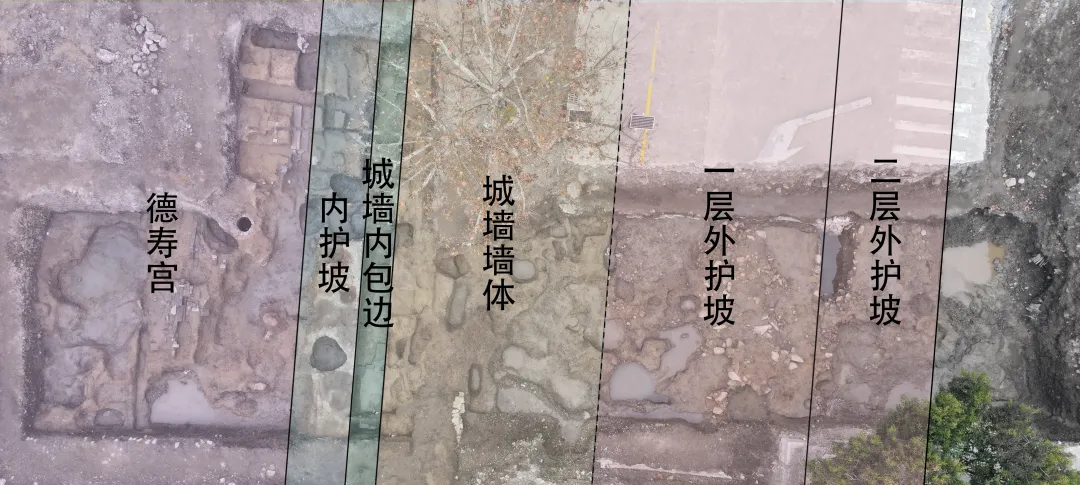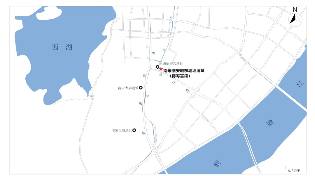 2025年6月至12月,为配合德寿宫遗址保护展示工程暨南宋博物院(二期)建设工程,经国家文物局批准,杭州市文物考古研究所对建设地块进行发掘,发掘区位于杭州市上城区小营街道,西侧紧邻德寿宫遗址博物馆,南邻望江路,东邻建国南路,发掘面积为1000平方米(图一)。此次发掘系统揭露了南宋临安城东城墙的结构,明确其营建次第,为临安城的研究提供了重要资料(图二)。