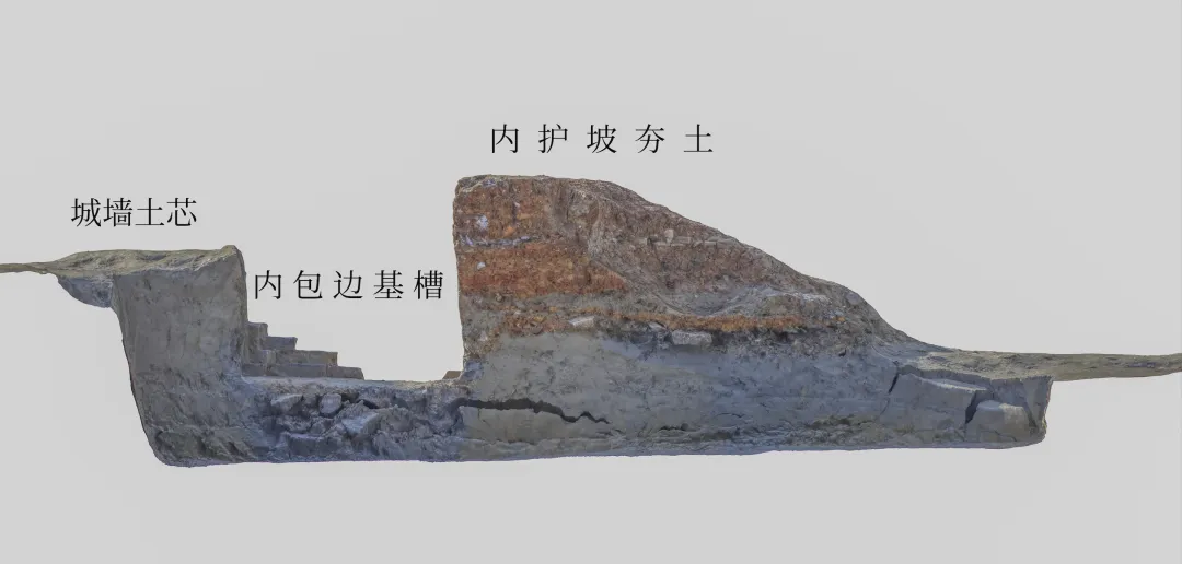 此外,内包边与红土基础间存在“错位”现象,包边整体向城墙方向后缩约7厘米,可见包边基础的城墙一侧砌筑于生土上,另一侧的红土基础为内护坡所叠压。据此可知其营建次第为包边基础夯筑完成后,先砌筑包边,后于西侧夯筑内护坡。