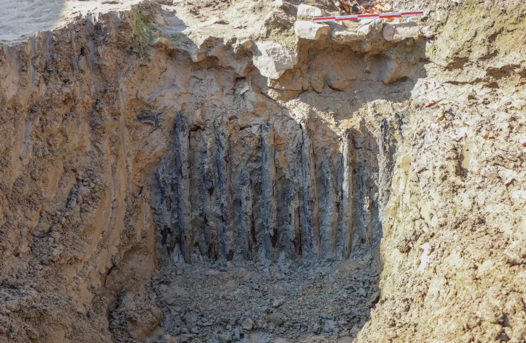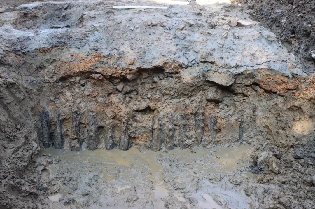 外护坡总宽15.5米,以大小不一的石块混杂黄色粉沙土堆砌而成。其中有两道砌筑相对规整的大石块和成排木制地钉形成的边界,据此可分为一层护坡和二层护坡。一层护坡宽9.8米,内部以石块混杂粉沙土填筑,局部可见石块表面残留一层薄红土,护坡边以大石块垒成,排布较规整,外侧打一排木桩加固,揭露深度1.6米,因渗水严重未能揭露至底(图六)。二层护坡边距一层护坡5.7米,内部填较小的石块混杂粉沙土,局部表层铺红土,边缘亦以较大的石块砌筑而成,但砌法不规整,石块外以向内倾斜的木质地钉加固,地钉间距约0.1米,直径0.15米,长2.1米,下部削尖,上部以卧木固定(图七、图八)。二层护坡外即为纯净的黄色粉沙土,本次发掘范围内未见明显土质土色变化,据此推测护城河在发掘区以东的位置。
