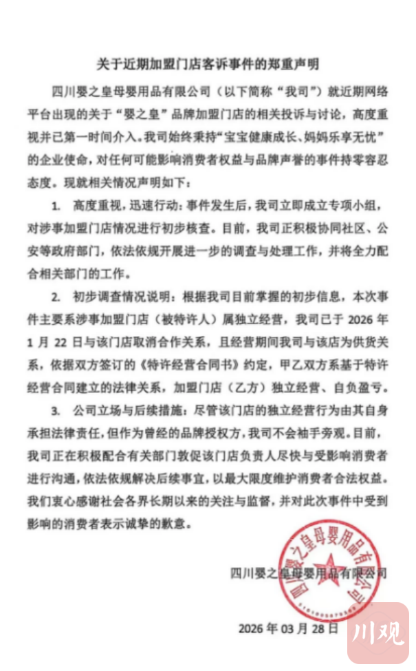 3月28日,四川婴之皇母婴用品有限公司发布声明称,公司已于1月22日与该门店解除特许经营合作关系,双方仅为供货关系,加盟门店独立经营、自负盈亏。同时声明表示,正配合相关部门督促门店负责人与消费者沟通解决问题。