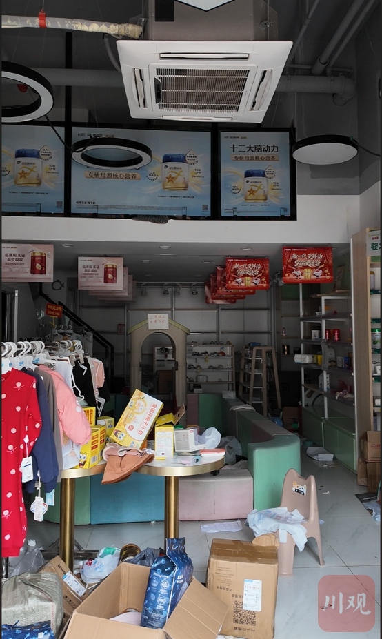 3月31日上午10点,记者跟随十多位充值消费者来到涉事门店,现场店铺大门紧闭,店内奶粉罐、婴儿用品散落一地,货品基本被搬空。据现场消费者介绍,该店原招牌为“baby king婴之皇中德英伦城邦店”,现已更换为“英伦婴皇”。