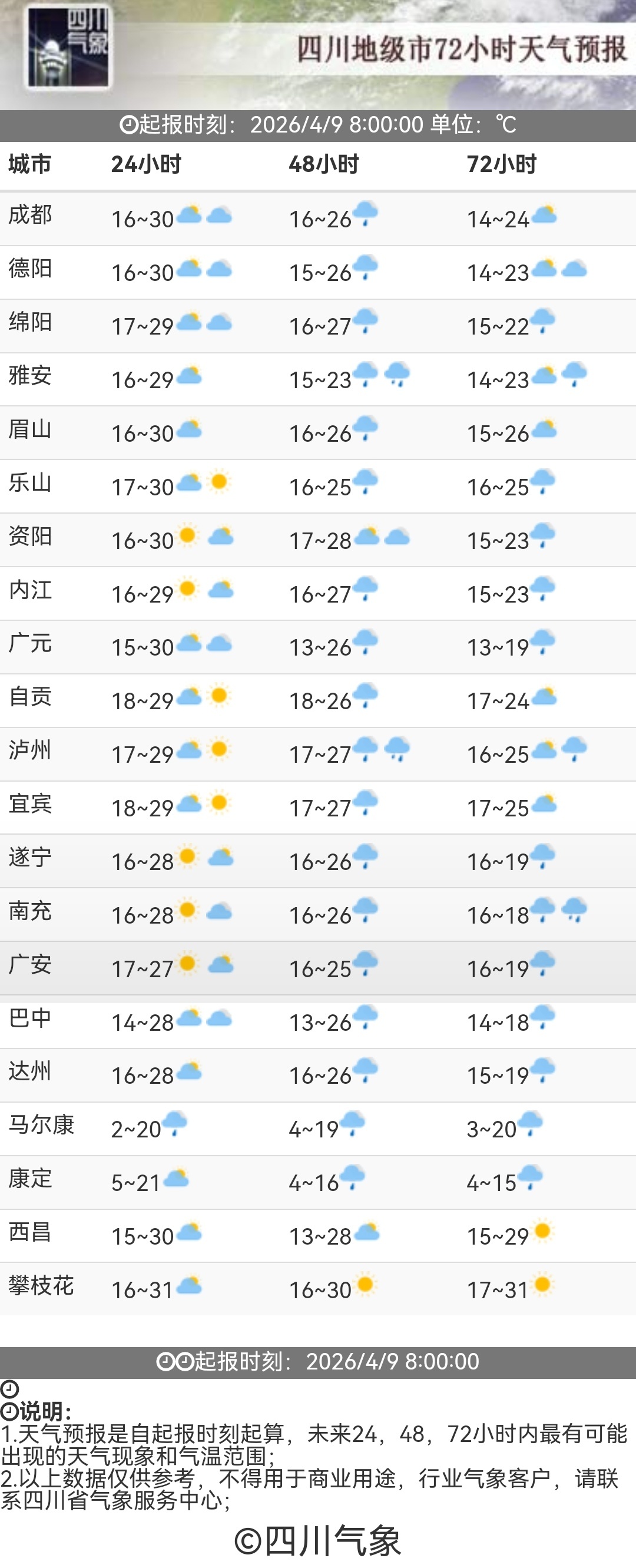 据四川省气象台今日(4月9日)早间预报,今天盆地最高气温27~30℃。其中,成都、德阳、雅安、眉山、乐山、广元6市将迎来今年首个30℃。乐山气象台甚至报出了31℃的最高气温。