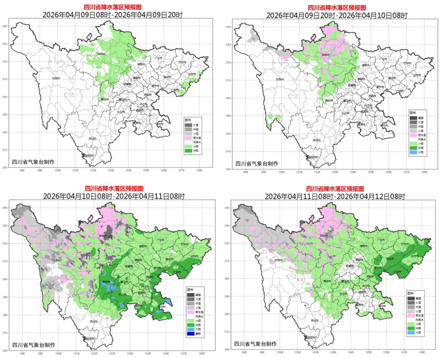 10日白天到晚上,盆地大部多云转阵雨或雷雨,其中西南部和东部的部分地方有中雨,个别大雨;阿坝州、甘孜州大部和凉山州北部阴天间多云有分散阵雨(雪)或雷雨,局部中雨或中雪,攀西地区的其余地方多云间晴。
