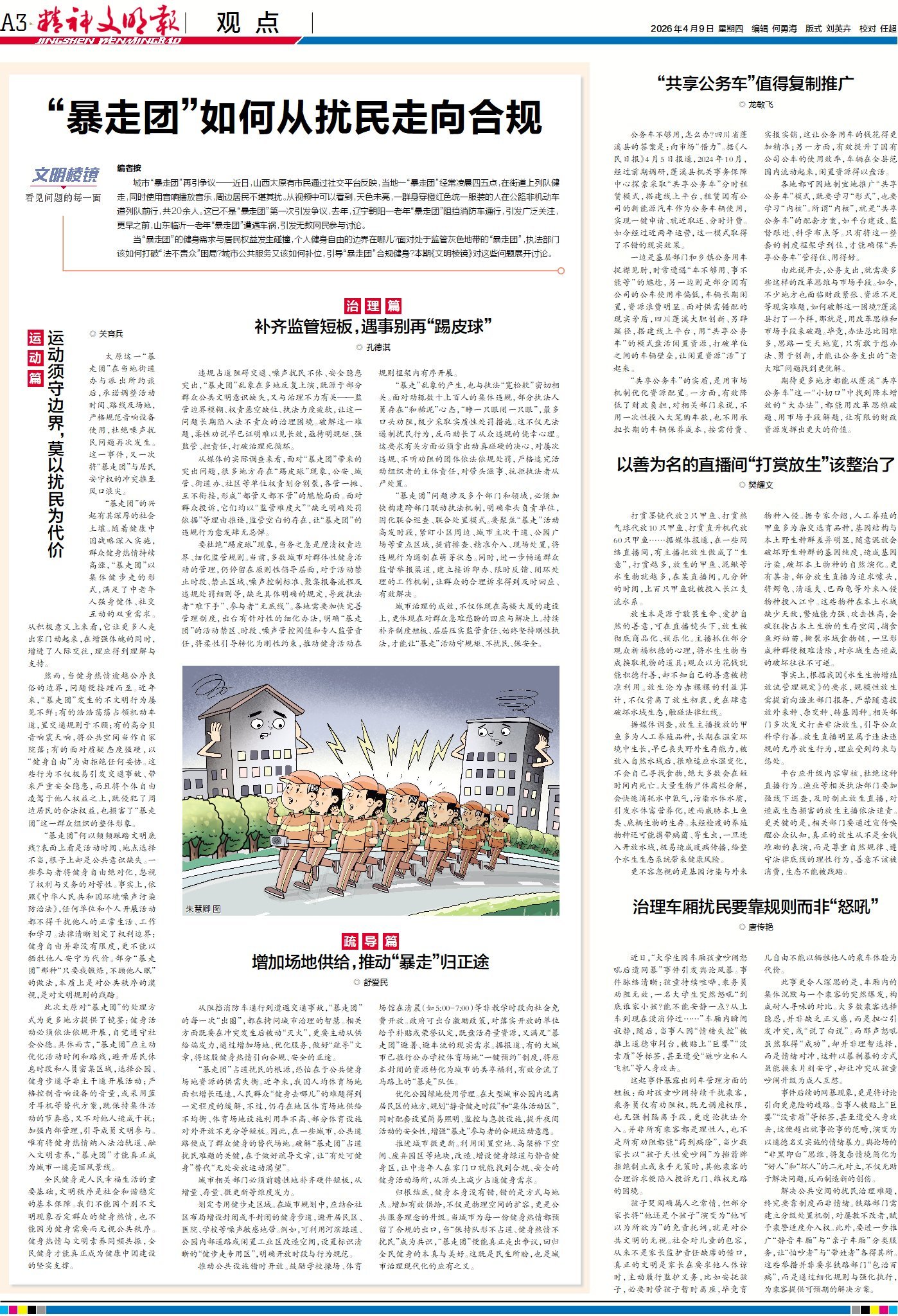 此次太原对“暴走团”的处理方式为更多地方提供了镜鉴:健身活动必须依法依规开展,自觉遵守社会公德。具体而言,“暴走团”应主动优化活动时间和路线,避开居民休息时段和人员密集区域,选择公园、健身步道等非主干道开展活动;严格控制音响设备的音量,或采用蓝牙耳机等替代方案,既保持集体活动的节奏感,又不对他人造成干扰;加强内部管理,引导成员文明参与。唯有将健身热情纳入法治轨道、融入文明素养,“暴走团”才能真正成为城市一道亮丽风景线。