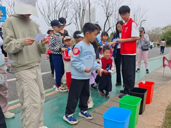 途中设置“垃圾分类投壶”“文明新风岔路口”“文明问答九宫格”“美景同框留声机”“清明知识飞花令”五个互动关卡,将环保知识、移风易俗、节日文化融入趣味挑战中。在志愿者的引导下,孩子们与家长携手合作,在答题闯关中学习垃圾分类、绿色祭扫、文明出游等知识,以小手拉大手的形式传递文明理念。