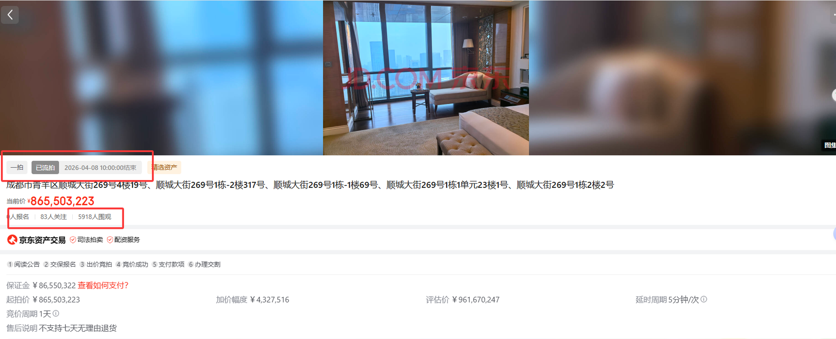 京东资产交易平台显示,此次拍卖于4月7日10时开始,至4月8日10时结束。但直至拍卖落幕,该标的物始终“无人问津”——0人报名、83人设置关注、近6000人围观。