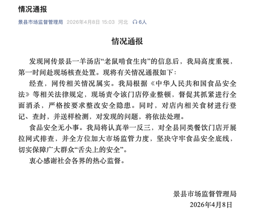 4月8日,景县市场监督管理局发布情况通报称,发现网传景县一羊汤店“老鼠啃食生肉”的信息后,该局高度重视,第一时间赴现场核查处置。现将有关情况通报如下: