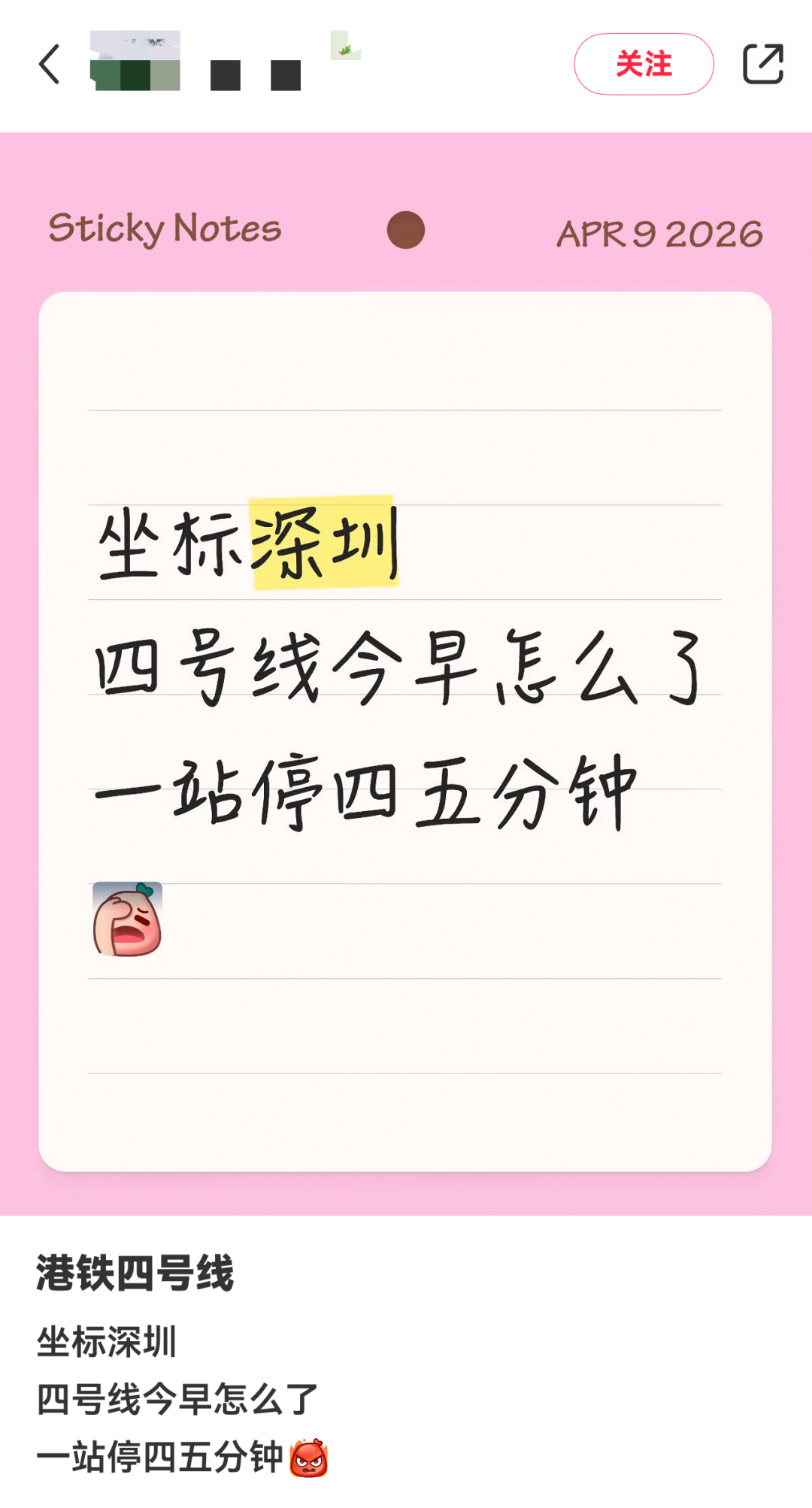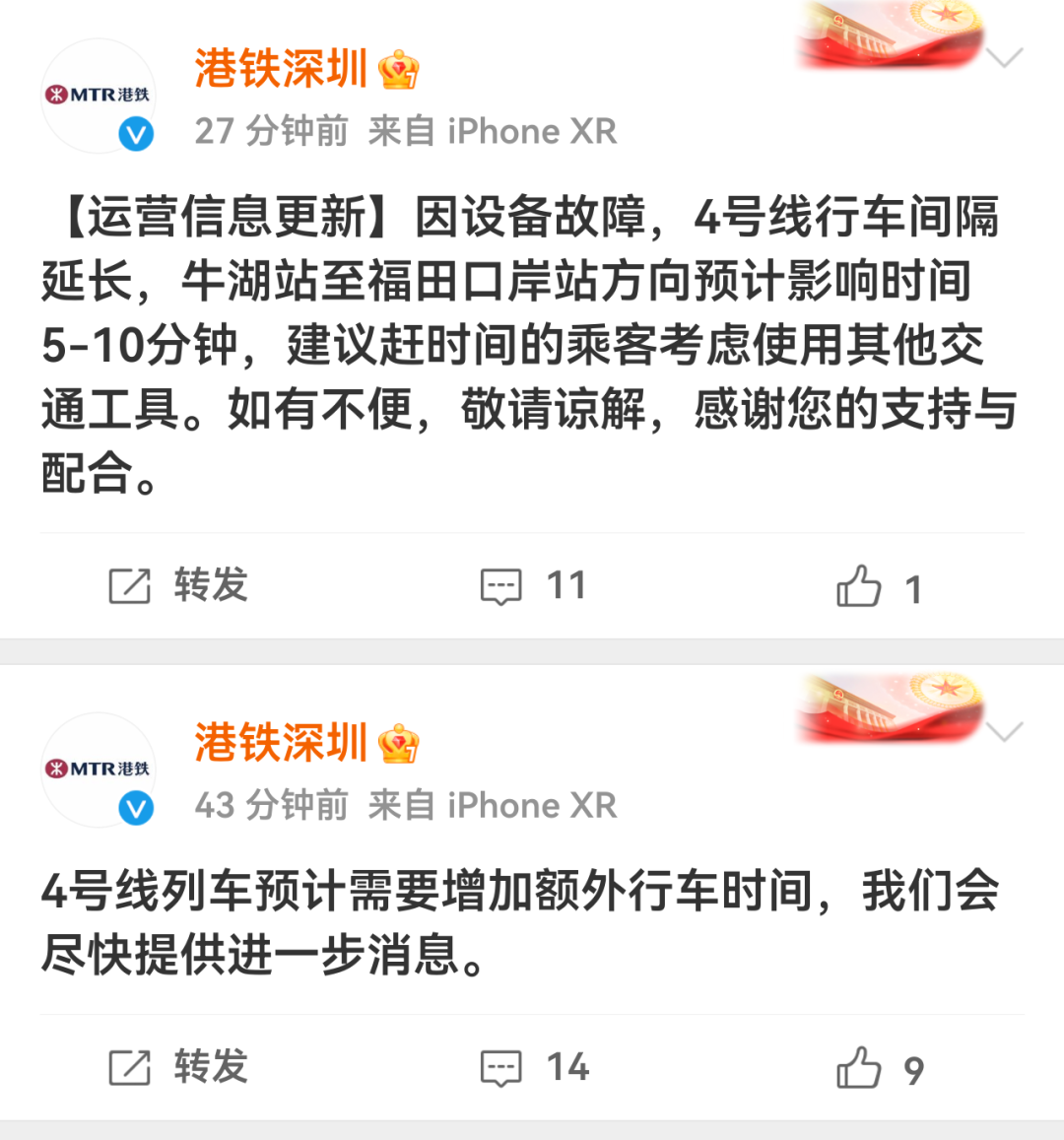 因设备故障,4号线行车间隔延长,牛湖站至福田口岸站方向预计影响时间5-10分钟,建议赶时间的乘客考虑使用其他交通工具。如有不便,敬请谅解,感谢您的支持与配合。