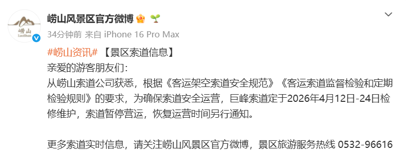 从崂山索道公司获悉,根据《客运架空索道安全规范》《客运索道监督检验和定期检验规则》的要求,为确保索道安全运营,巨峰索道定于2026年4月12日-24日检修维护,索道暂停营运,恢复运营时间另行通知。
