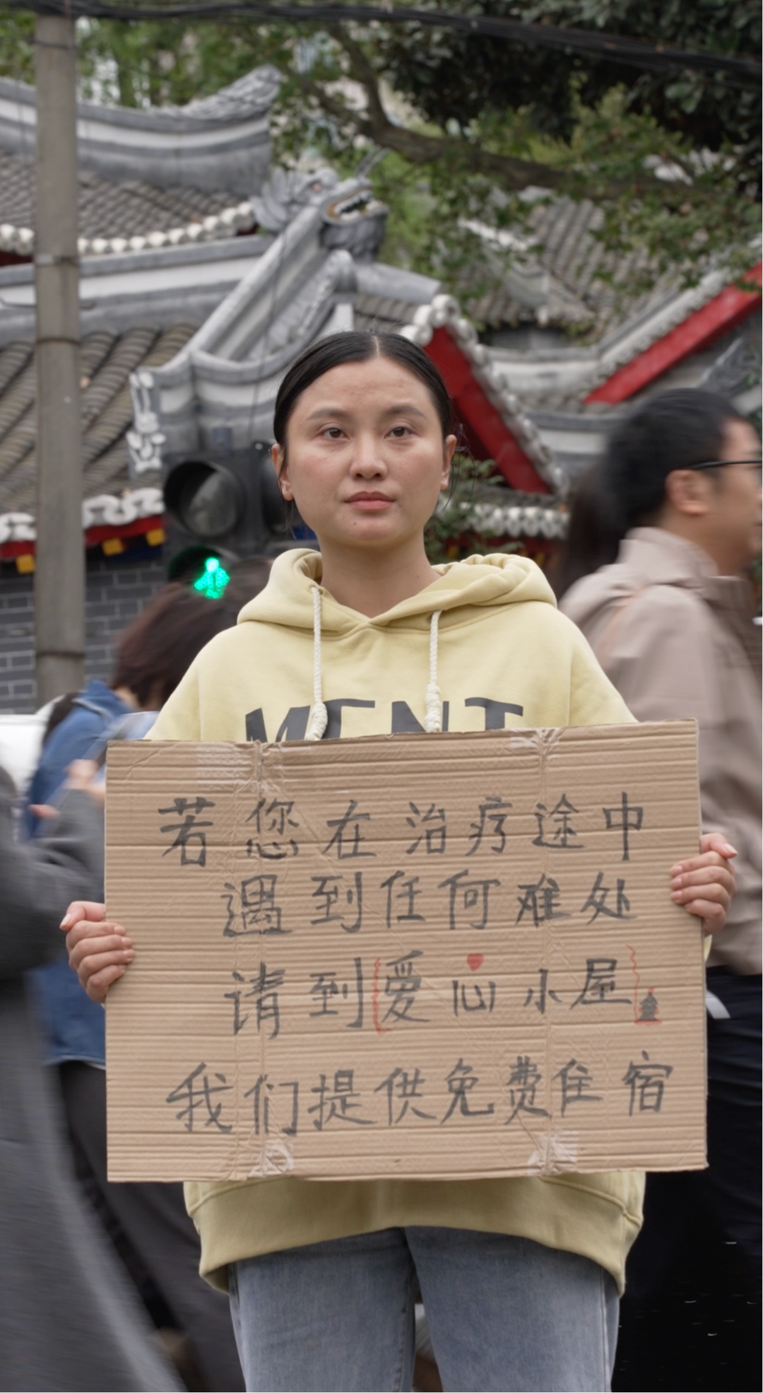 人群中,有一个身影格外显眼:她手里举着一块牌子,步履平缓地在人流中穿梭。牌子上的字简单又直白——爱心小屋免费住宿、吃饭、洗澡。
