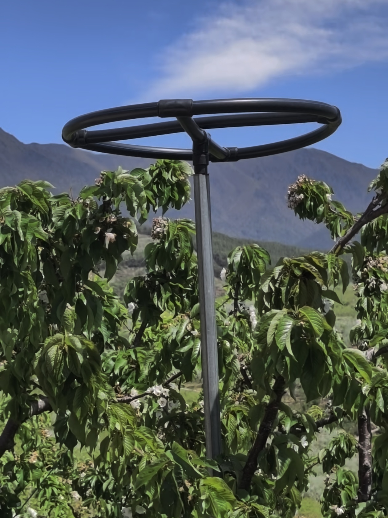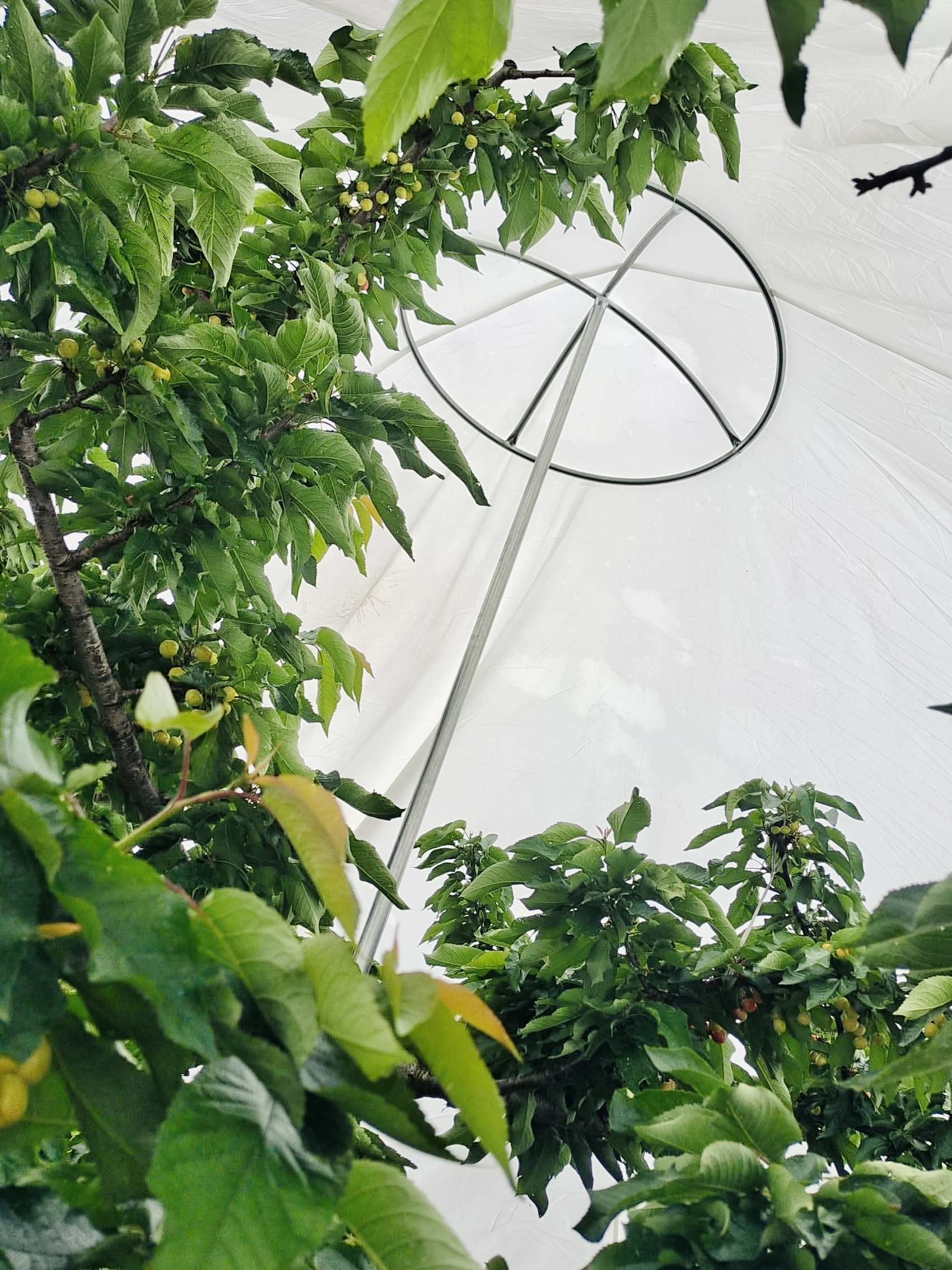 这个被果农们亲切称为油纸伞的装置,其实是一种可移动的树冠覆盖系统:一个直径约半米的圆环被一根长约2米的钢管高高撑起,圆环上覆盖着一层透明轻便、随取随用的农用漫散射塑料薄膜。薄膜透光率高,能将直射光转化为均匀的散射光,既保证了樱桃生长所需的光照,又能有效避开雨水带来的病虫害。