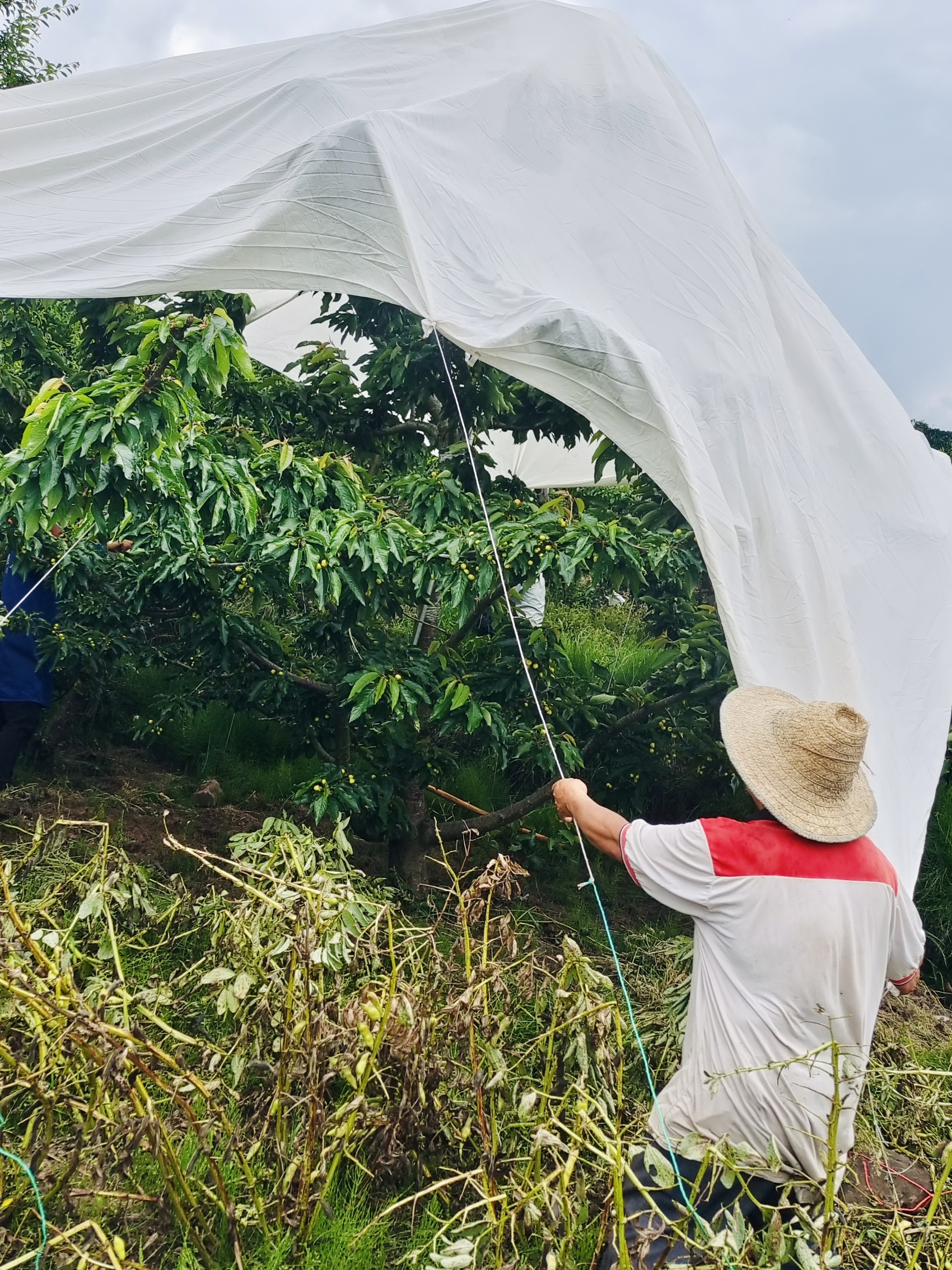 工人支起甜樱桃专用油纸伞。