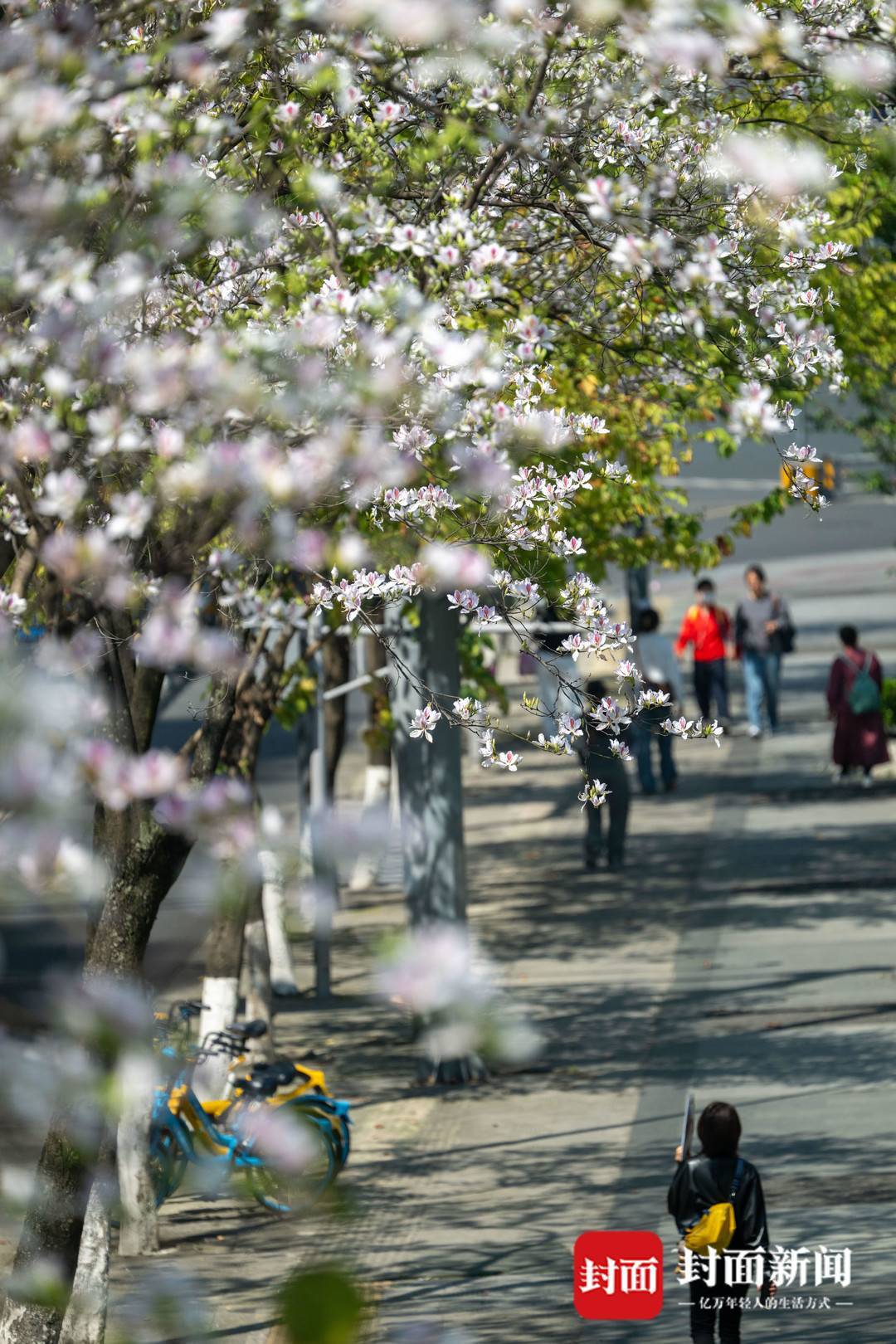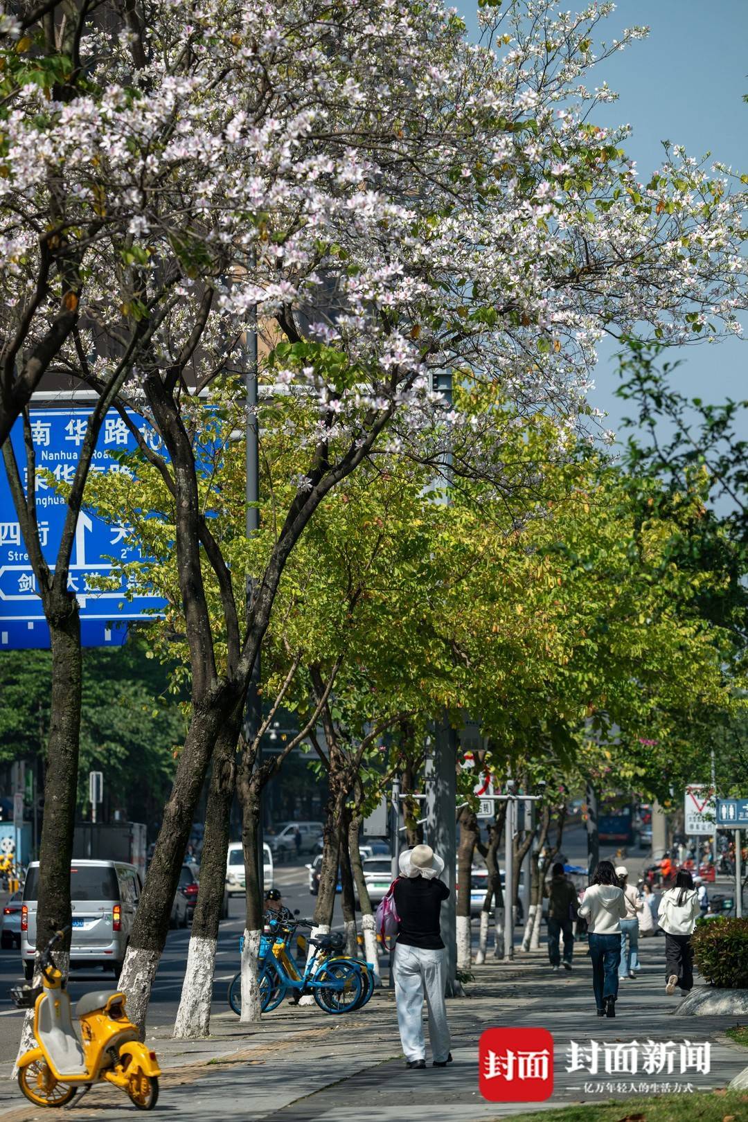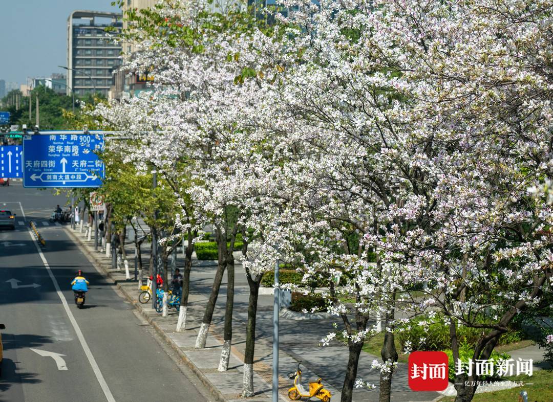 四月的成都街头,到处花红柳绿。大源中央公园附近,街道两旁的羊蹄甲开得正艳。