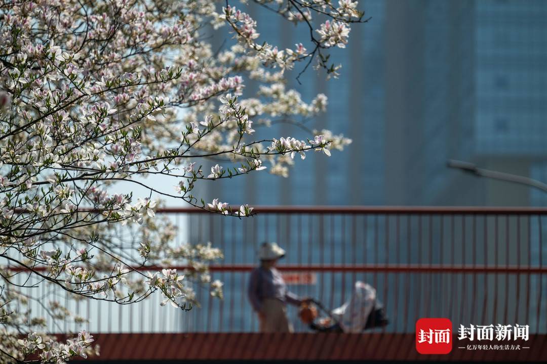 阳光下,绵延成片的粉色花雾,让街头两边的高楼尽显温柔。
