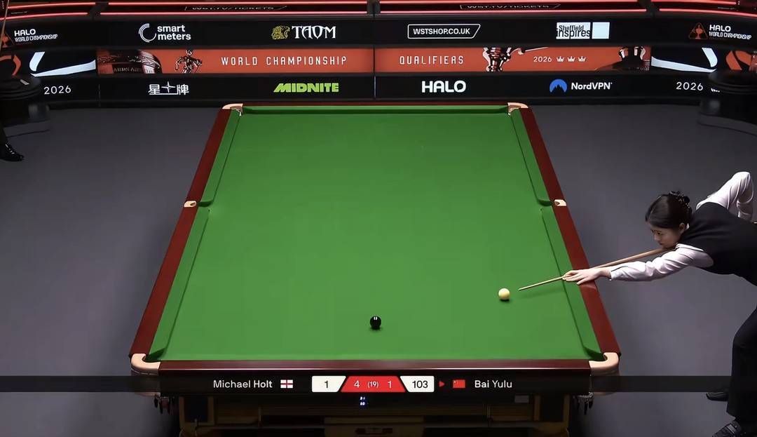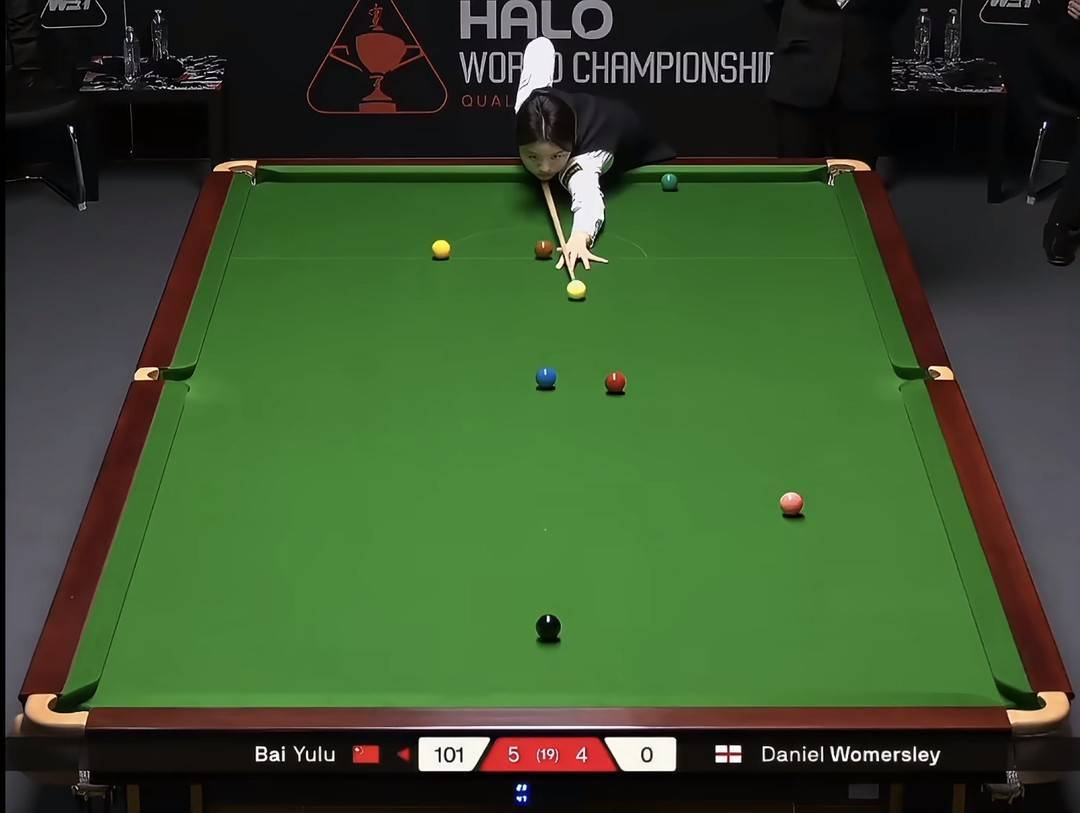 白雨露在2026斯诺克世锦赛资格赛比赛中,首场比赛打出单杆破百。视频截图