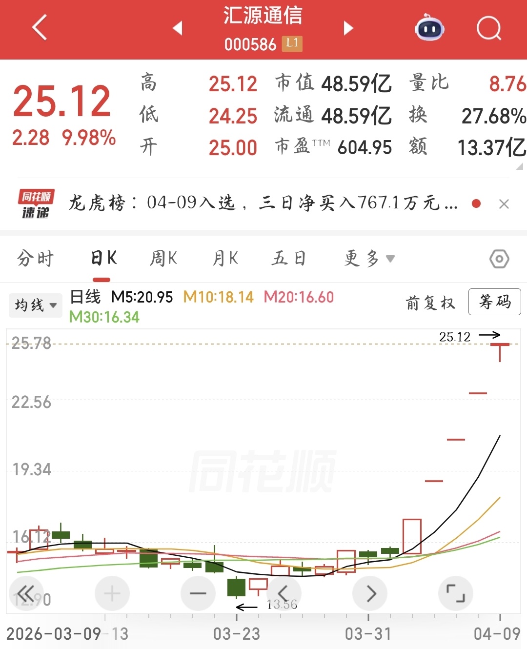 在普跌行情中,川股汇源通信强势斩获5天5板,成为市场资金追逐的焦点之一。该公司1995年上市,主营业务涵盖光纤光缆及相关产品业务、在线监测相关产品业务和通信工程及系统集成业务,是国家级专精特新“小巨人”企业。消息面上,中国市场G652.D光纤价格较去年低点涨超400%,机构预计2026—2027年全球供需缺口扩大至15%,汇源通信成为光纤概念板块领涨股。