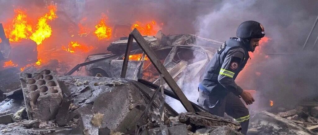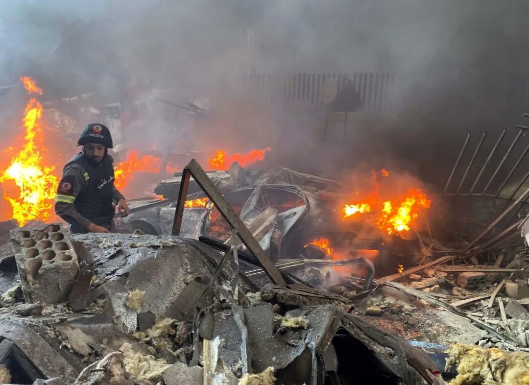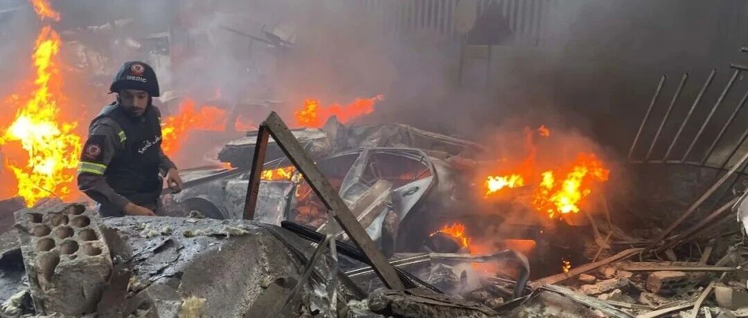 4月8日,救援人员在黎巴嫩首都贝鲁特扑救以色列空袭引发的火灾(手机照片)。新华社发(比拉尔·贾维希 摄)