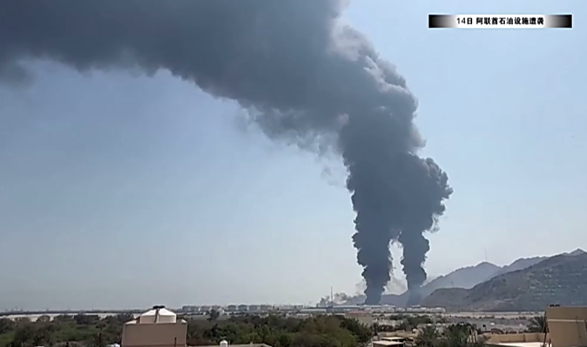 当地时间3月14日,阿联酋石油设施遭袭。图片来自央视新闻