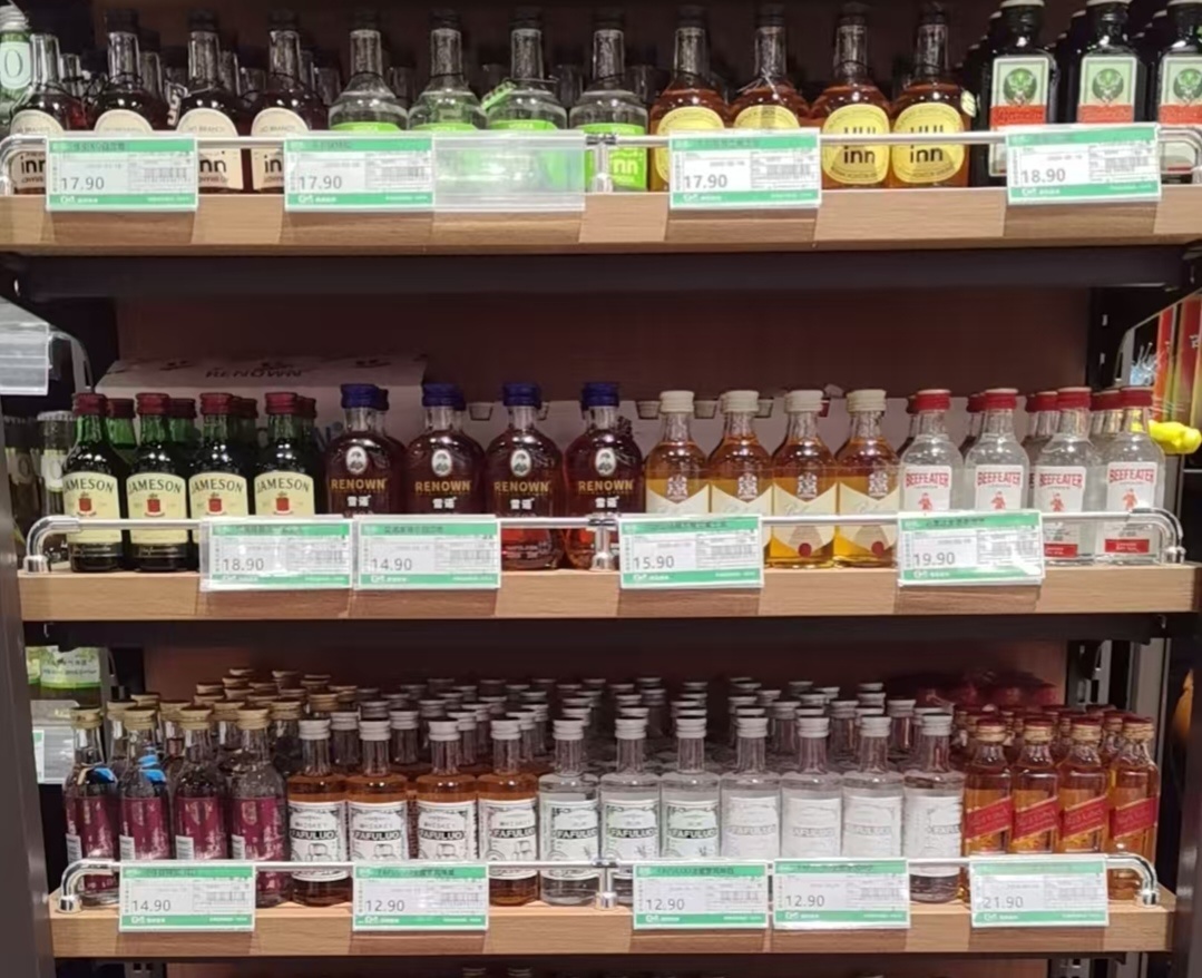 4月9日上午,记者在成都城南一家中型连锁超市看到,原本堆满泡面和薯片的货架角落设置了一个独立的小酒专区。果味白酒、小瓶威士忌、白兰地……花花绿绿的酒标挤在一起,旁边还贴着手写提示:“推荐搭配:柠檬茶+白兰地,冰杯+果酒”。不少年轻人正在熟练地挑选产品,一瓶小酒、一杯饮料、一份冰块,一套总价为25—35元。