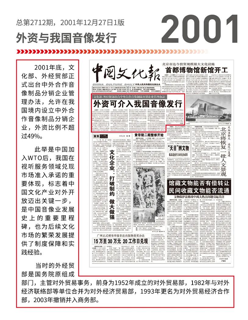 2001年底,文化部、外经贸部正式出台中外合作音像制品分销企业管理办法,允许在我国境内设立中外合作音像制品分销企业,外资比例不超过49%。