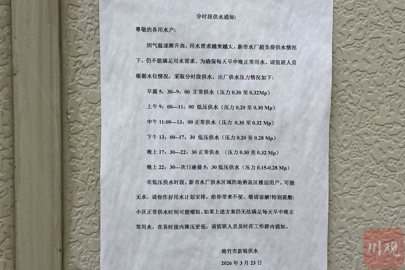 近日,记者来到绵竹市新市镇花园一期进行调查走访。这是一个没有电梯的多层安置小区,外观较为陈旧。小区门口张贴着一张“分时段供水通知”,落款日期为2026年3月23日。