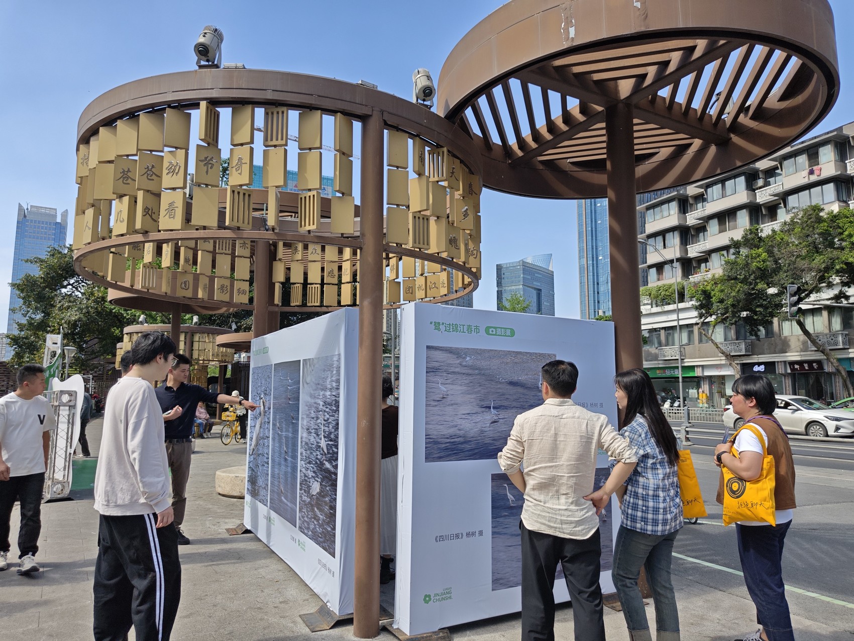 活动现场,生态影像展与苍鹭知识科普展展开。摄影爱好者带来的“鹭鸟”与市井烟火主题作品一一陈列:苍鹭抖脚的俏皮瞬间、烟火牛市口的老街巷、府河春色……市民一边看“洗脚鸟”萌态,一边通过科普展了解苍鹭的习性、迁徙规律及其在城市生态系统中的角色。