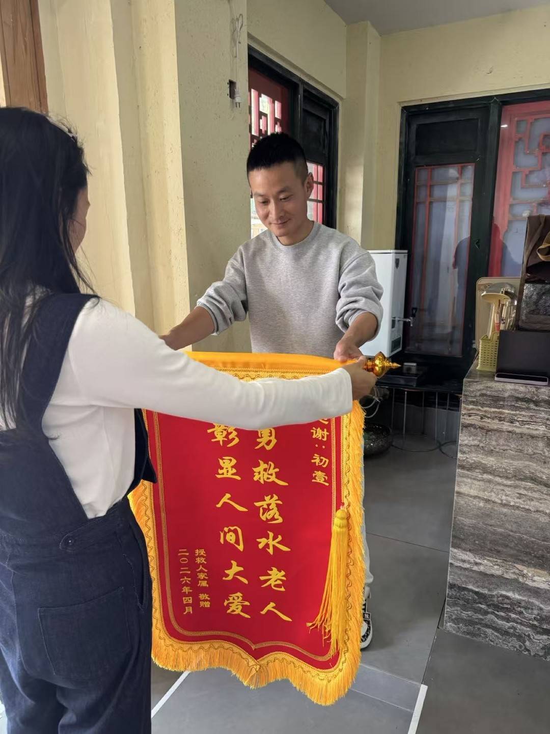 4月8日,写着“勇救落水老人·彰显人间大爱”的锦旗,送到了成都市郫都区三道堰镇惠里景区一家茶楼老板许康和八步桥社区巡逻队员曾才华的手中。送锦旗的人是古堰社区居民刘群(化名)的家属,“真的太感谢他们了,要是没有他们及时施救,我们家老人恐怕凶多吉少。他们不顾个人安危,挺身而出救了老人的命,这份恩情我们全家一辈子都记在心里。”这面锦旗承载着全家的感激之情,也还原了一段分秒必争的生命救援佳话。