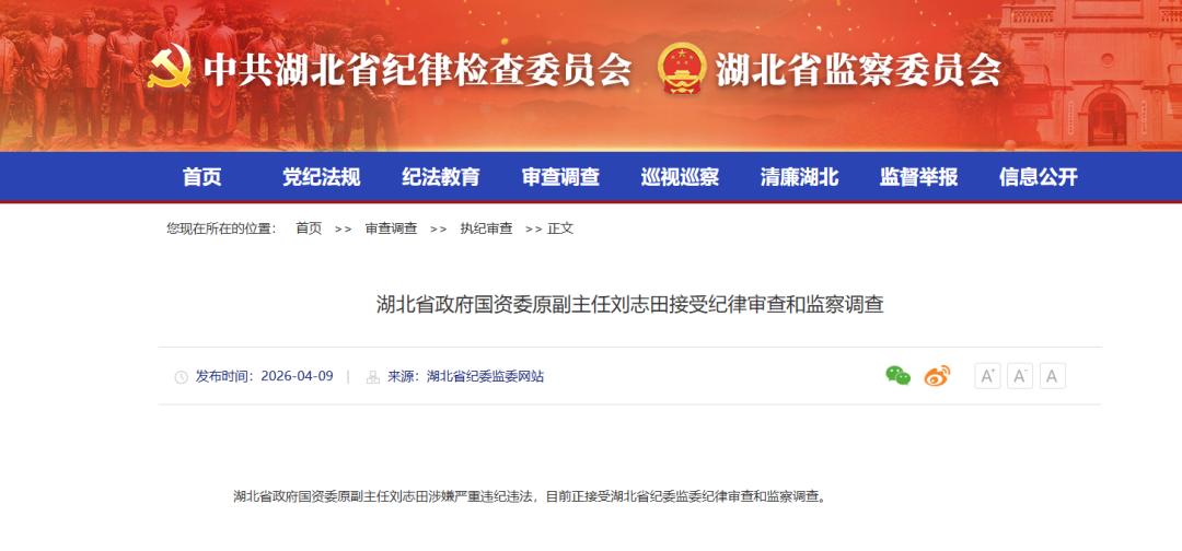 据湖北省纪委监委消息:湖北省政府国资委原副主任刘志田涉嫌严重违纪违法,目前正接受湖北省纪委监委纪律审查和监察调查。