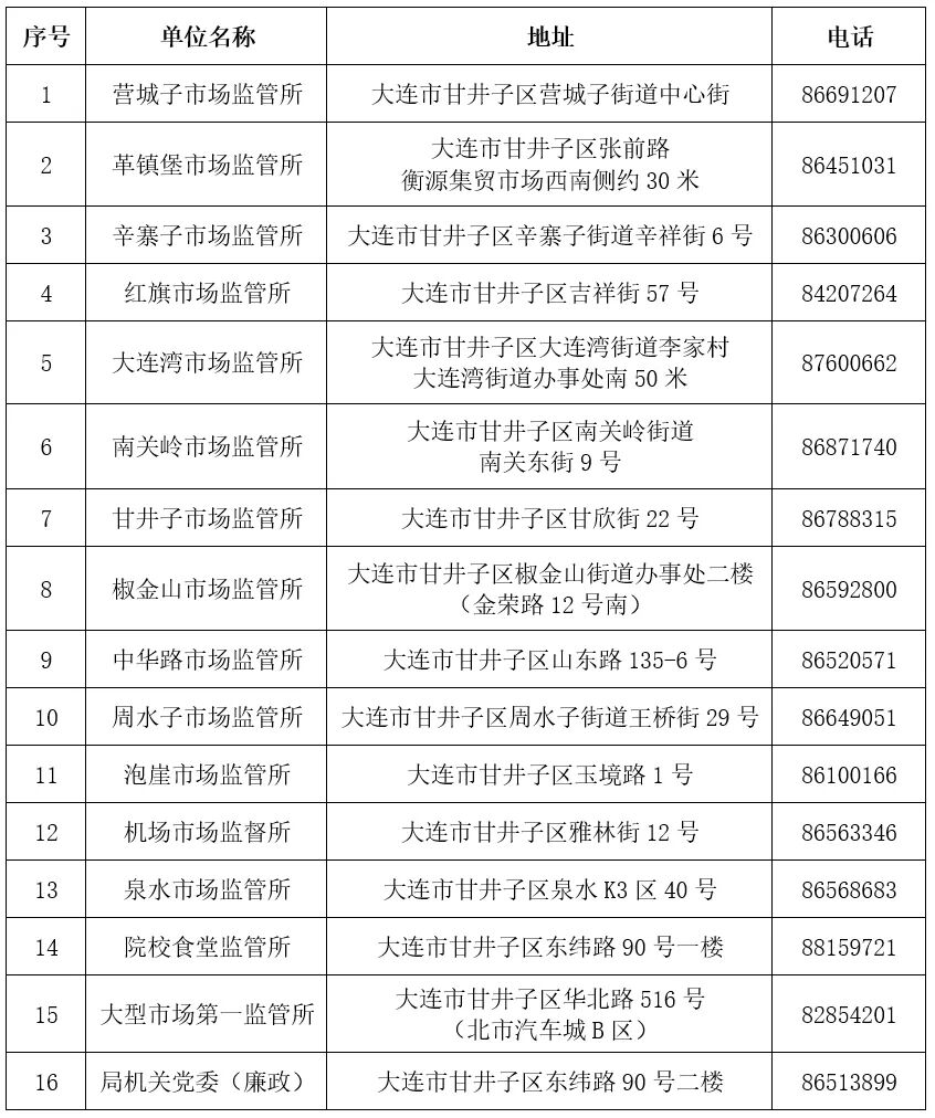 大连市甘井子区市场监管局公布