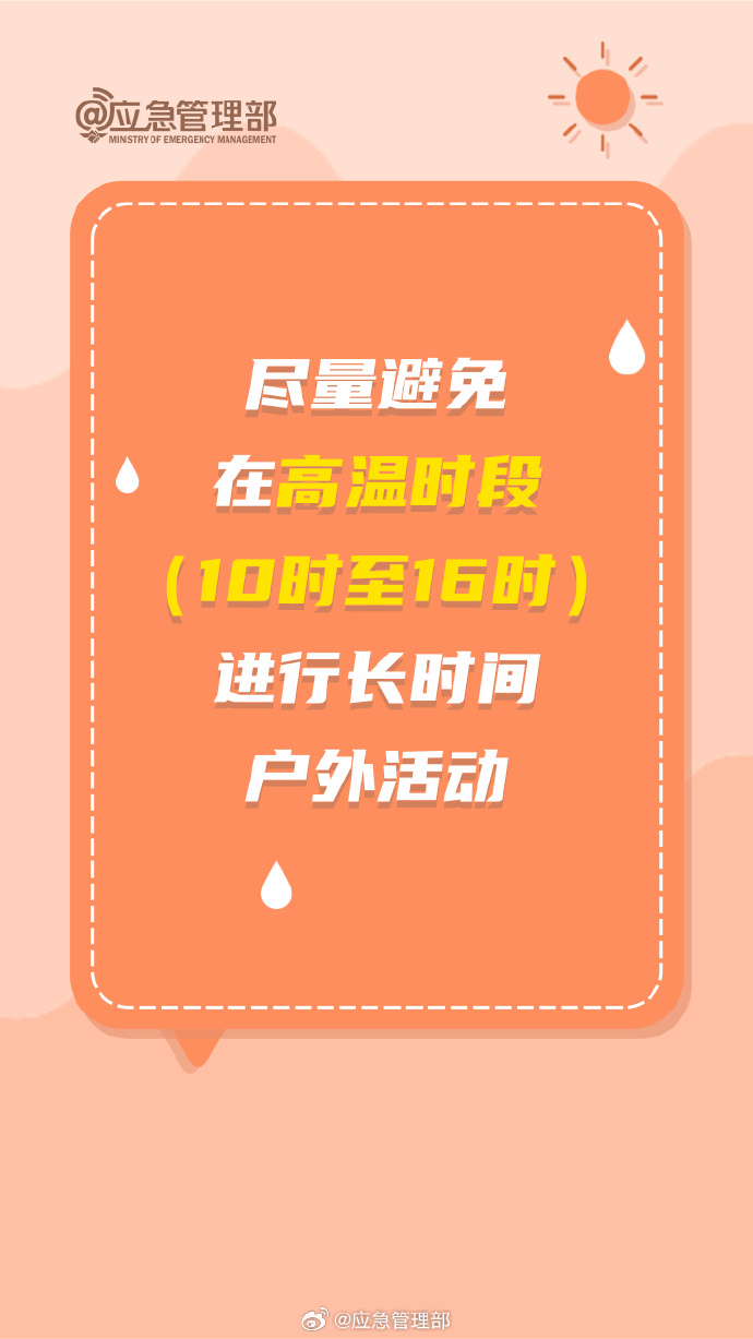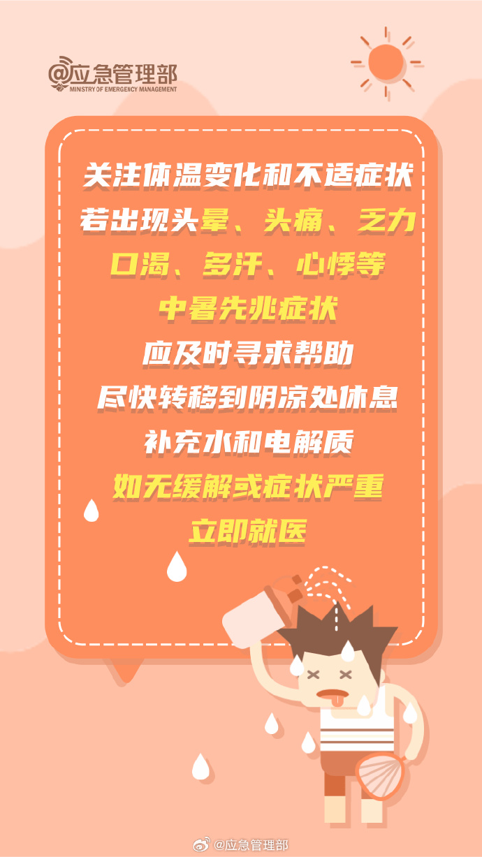 大家要及时补水、减少户外暴晒,遇不适立即采取防暑措施。