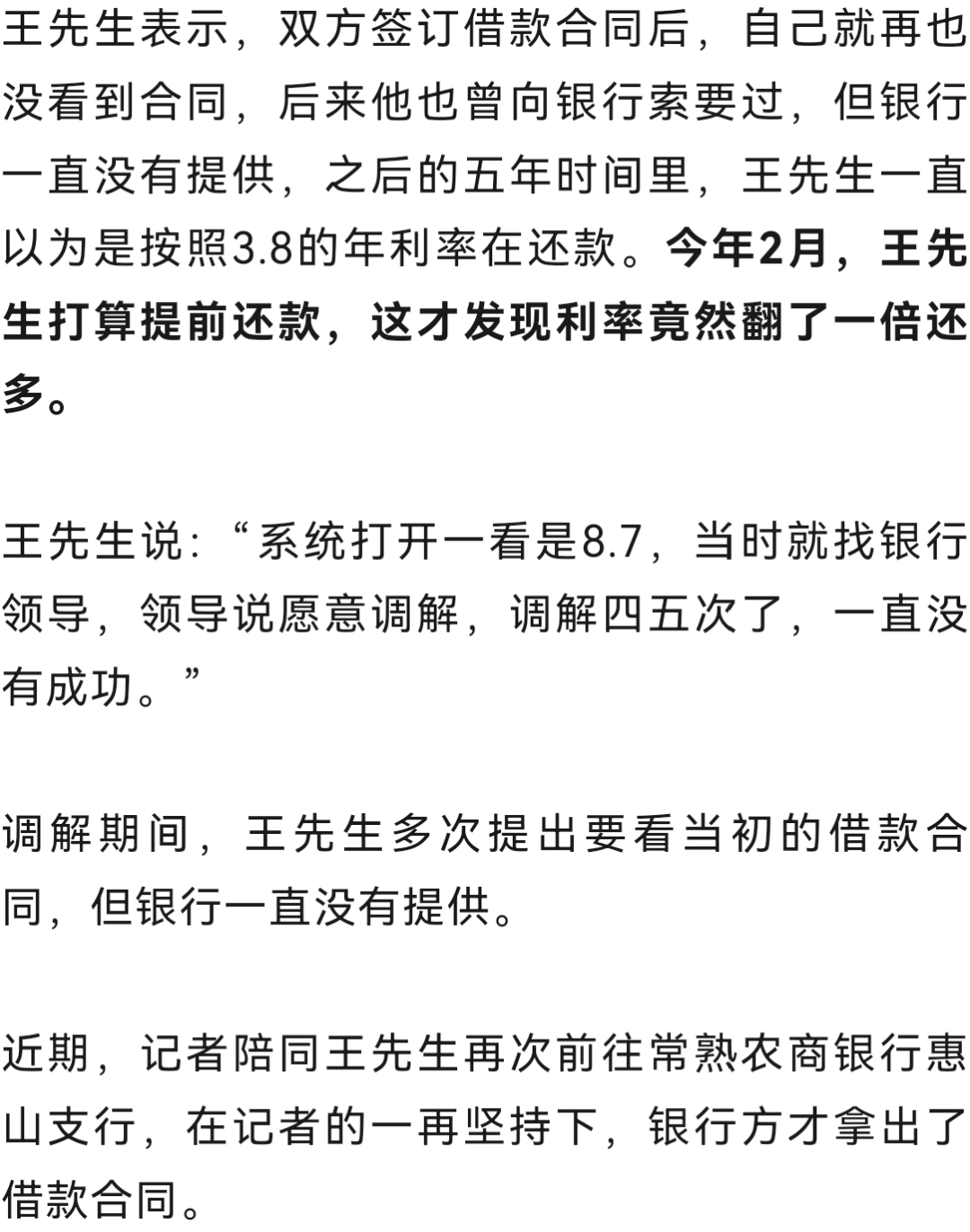王先生说:“当时,利率那一页没给我看,直接就翻过去,对方说这些都不用看,都是条条框框的,只要签字就行,之前说好的年利率是3.8。”