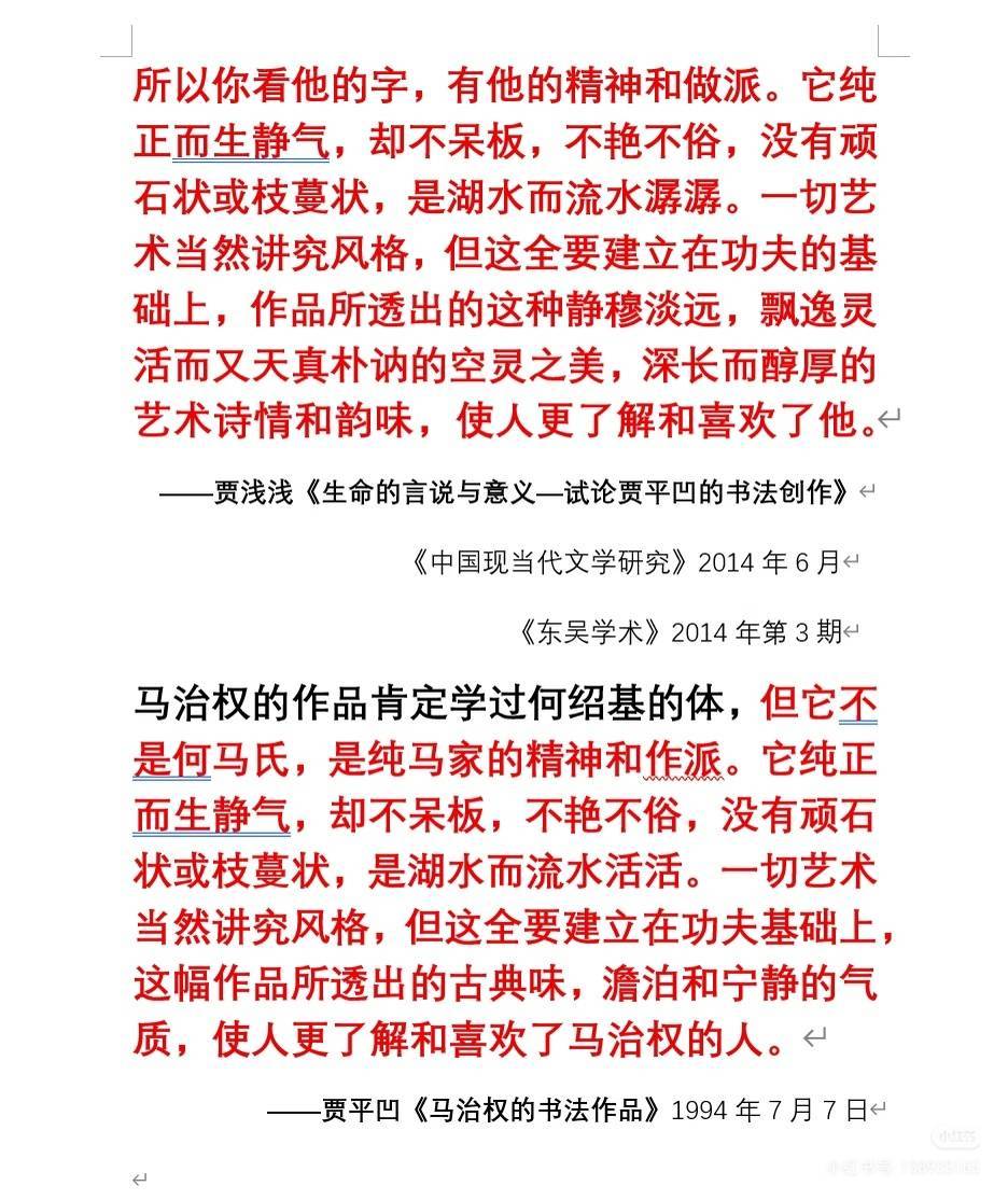 其中,2014年发表于中国作家协会主管的国家重点学术期刊《中国现当代文学研究》的《生命的言说与意义——试论贾平凹的书法创作》与贾平凹发表于1994年7月的《马治权的书法作品》存在段落重合。