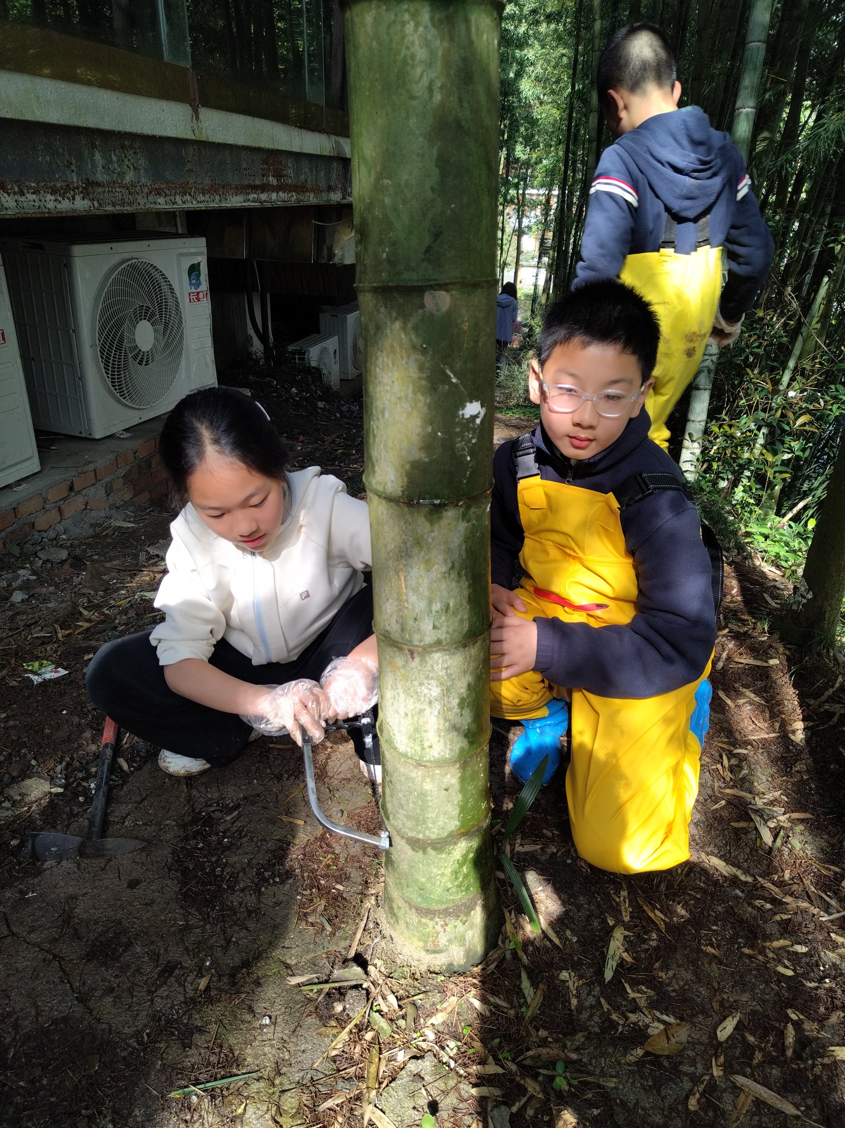 小朋友在林间打卡点完成打卡标记