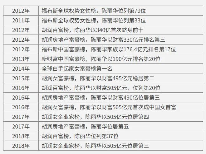 2016年胡润女富豪榜,陈丽华以财富505亿元首次成中国女首富。2018年的胡润女企业家榜,陈丽华以505亿元位居第三。