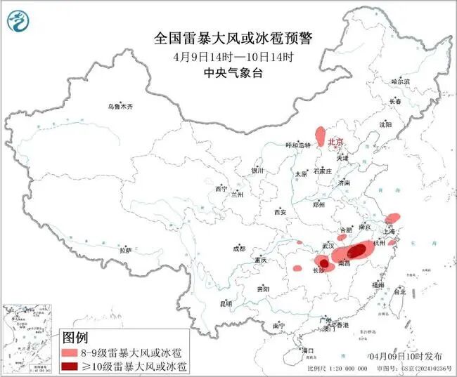 预计9日14时至10日14时,江南北部、河北西北部等地的部分地区将有8级以上雷暴大风或冰雹天气,其中,安徽南部、湖南东北部、江西北部等地的部分地区将有10级以上雷暴大风,最大风力可达11级以上,局地不排除出现龙卷的可能性。预计,强对流的主要影响时段为今天下午至夜间。
