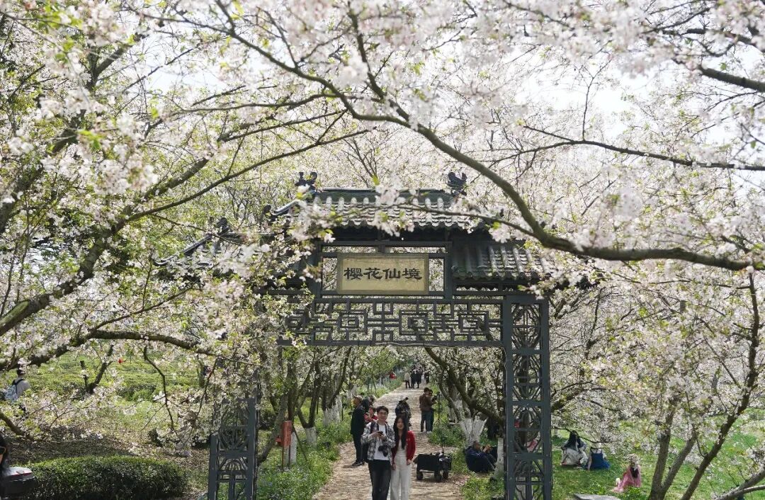游人在江西省南昌县凤凰沟景区樱花谷观赏盛开的樱花(4月1日摄)。万象摄(新华社)