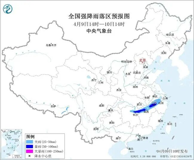 预计9日14时至10日14时,安徽南部、湖南东北部、江西北部、浙江西部等地部分地区有大到暴雨,其中,安徽南部等地部分地区有大暴雨(100至110毫米)。上述部分地区伴有短时强降水(最大小时降雨量20至40毫米,局地可超过50毫米),局地有雷暴大风或冰雹等强对流天气。