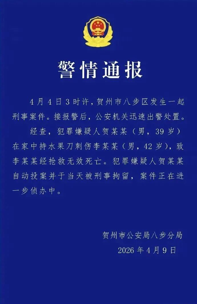 4月4日3时许,贺州市八步区发生一起刑事案件。接报警后,公安机关迅速出警处置。经查,犯罪嫌疑人贺某某(男,39岁)在家中持水果刀刺伤李某某(男,42岁),致李某某经抢救无效死亡。犯罪嫌疑人贺某某自动投案并于当天被刑事拘留,案件正在进一步侦办中。
