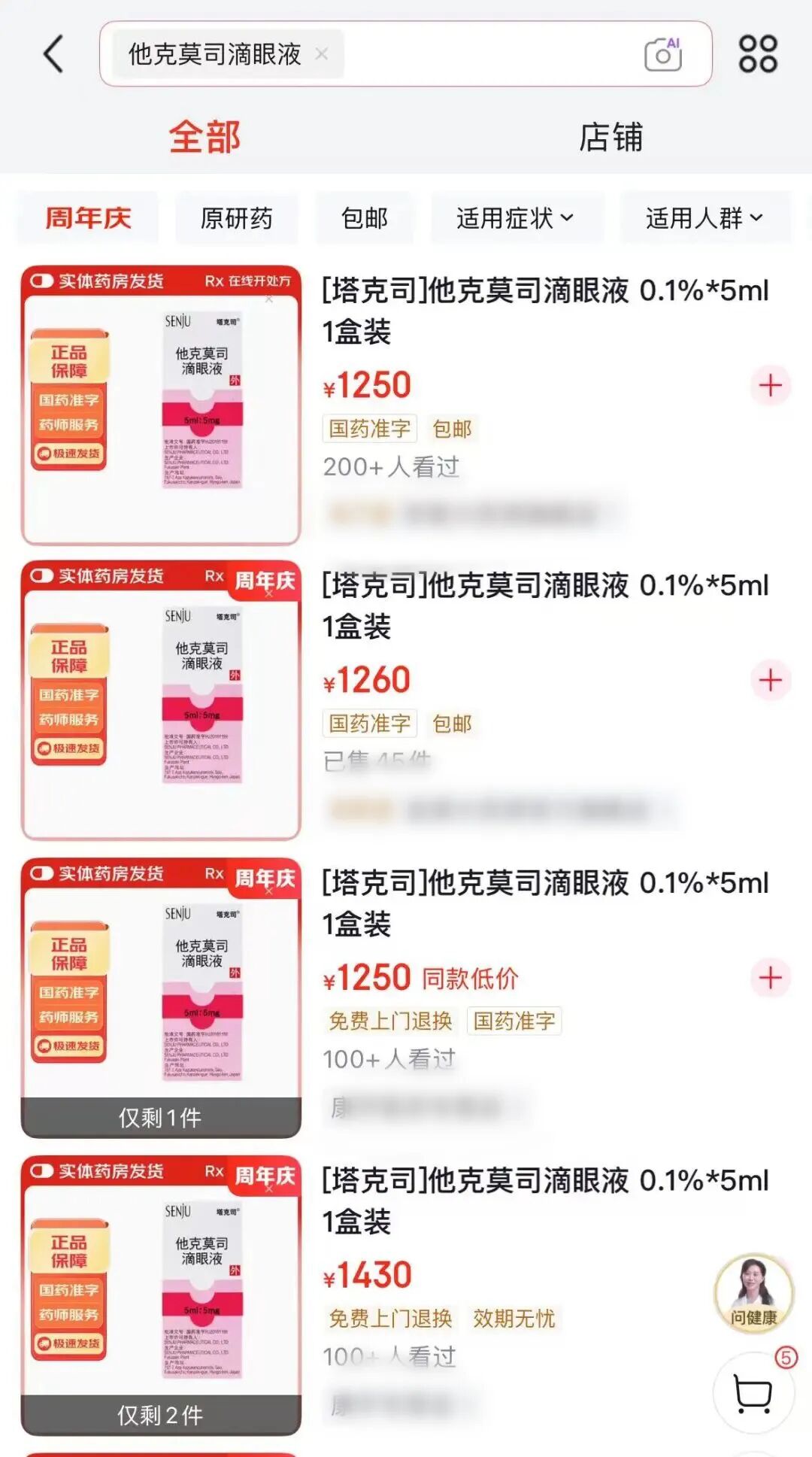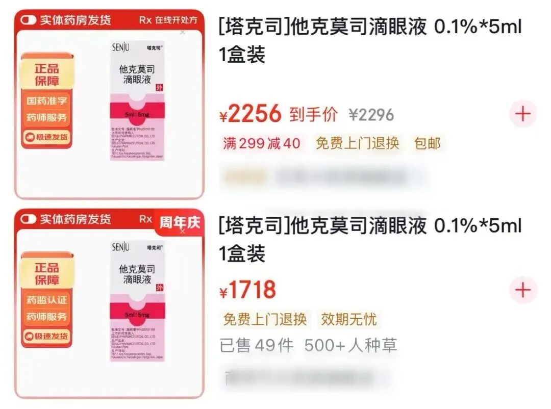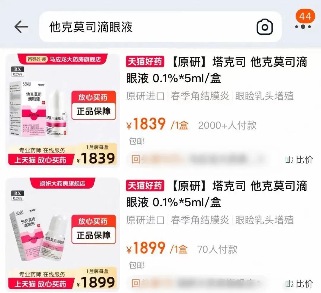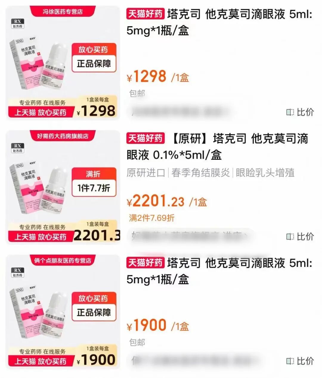 近日,刘女士的孩子因角膜移植术后,需要长期使用他克莫司滴眼液。然而,最近一次复查开药时,该药在医院缺货,刘女士需自行网购。她发现,原本700多一支的滴眼液,平台价格涨到了1700-2000多元不等,个别平台价格甚至翻了四倍。不少患者也在社交平台吐槽,该药因缺货大幅涨价。