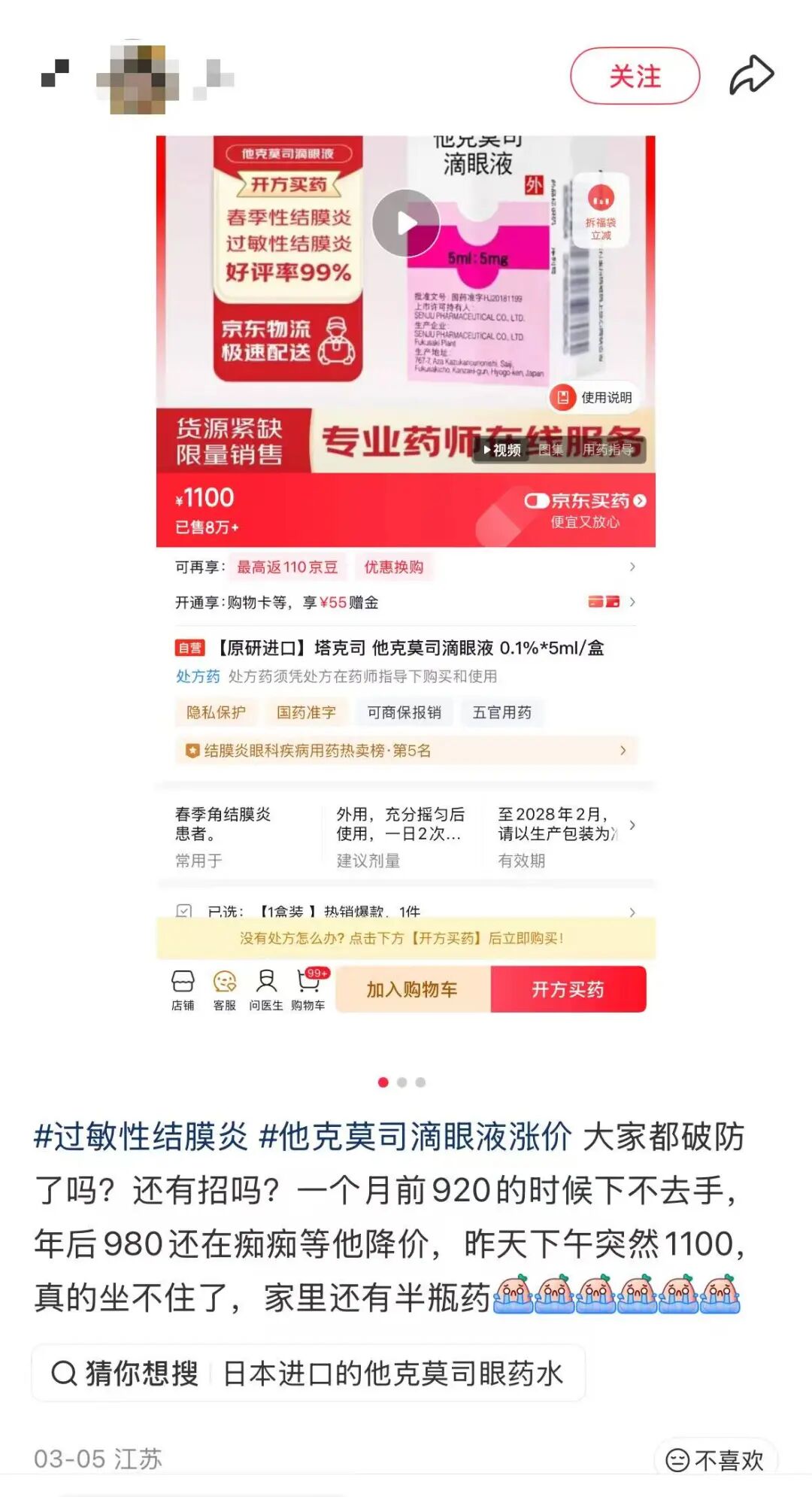 据了解,相较于激素类眼药水,他克莫司滴眼液因其舒适度更高、风险更小,备受患者青睐。原厂生产供应不足,加上当前角结膜炎高发期,临床需求大幅攀升,更是进一步加剧了药品的紧缺状况。